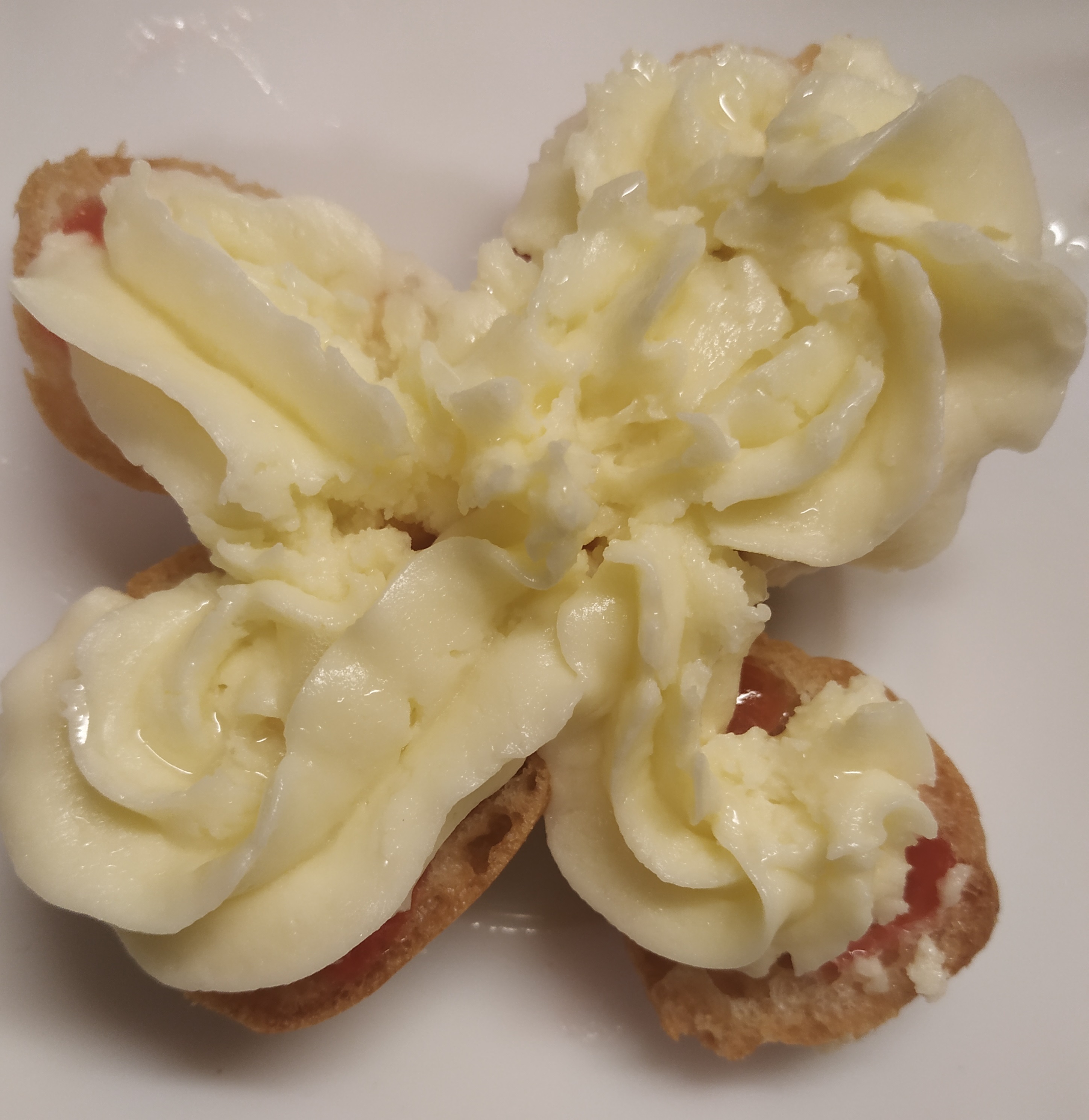 Mientras se hornean los eclairs aprovecharemos para hacer nuestra crema de relleno. Ponemos en el vaso la mantequilla ( a temperatura ambiente) y el azúcar y programamos 1min/vel 4, pasado ese tiempo ponemos la mariposa y programamos 3min/vel 3.5. Una vez hecho añadiremos el mascarpone y programaremos 3min/vel2.5, nos ha de quedar una crema uniforme, lisa y firme. Sino es así lo pondremos 30seg más. Llenamos la manga con la boquilla rizada con esta crema.