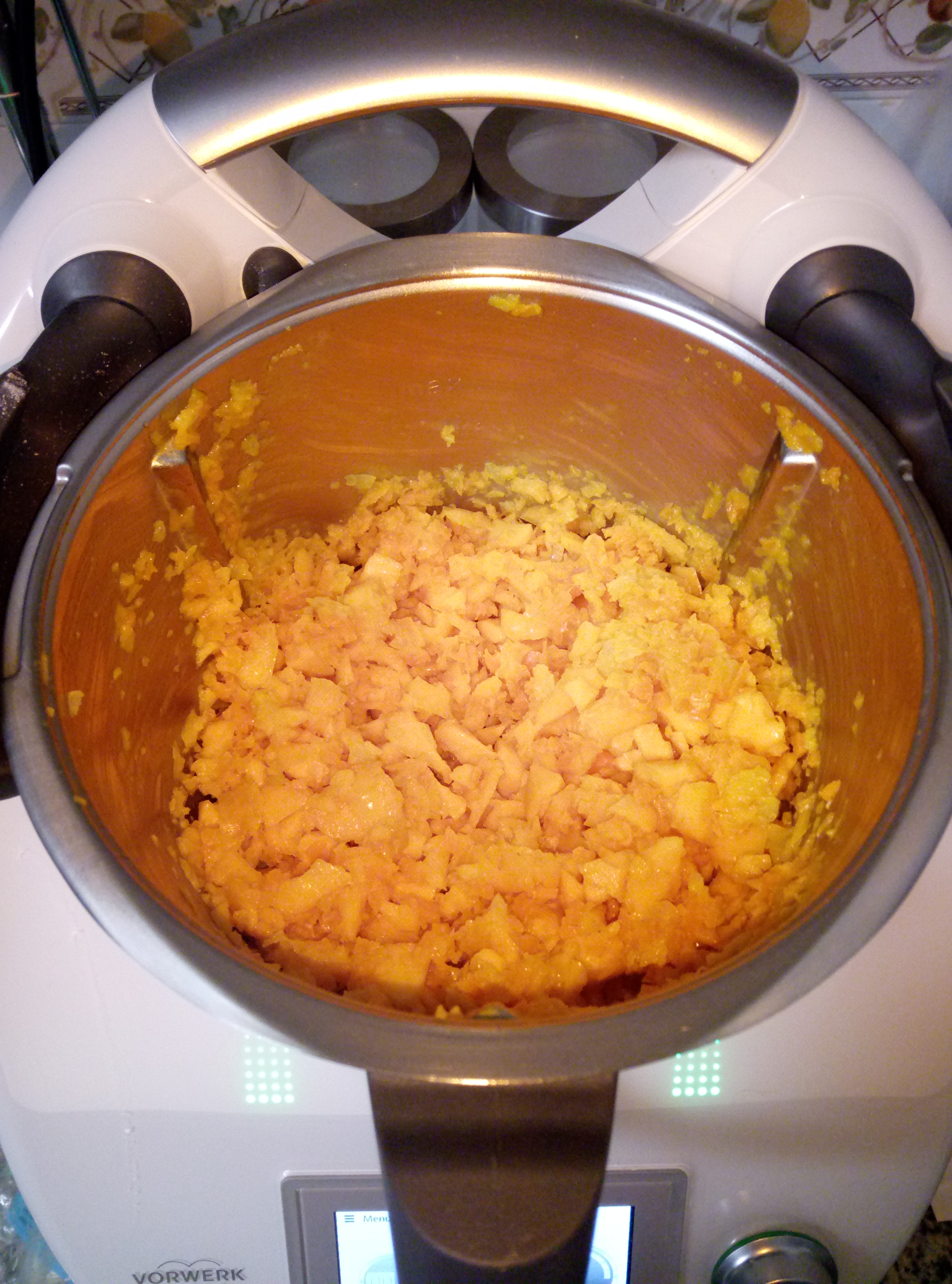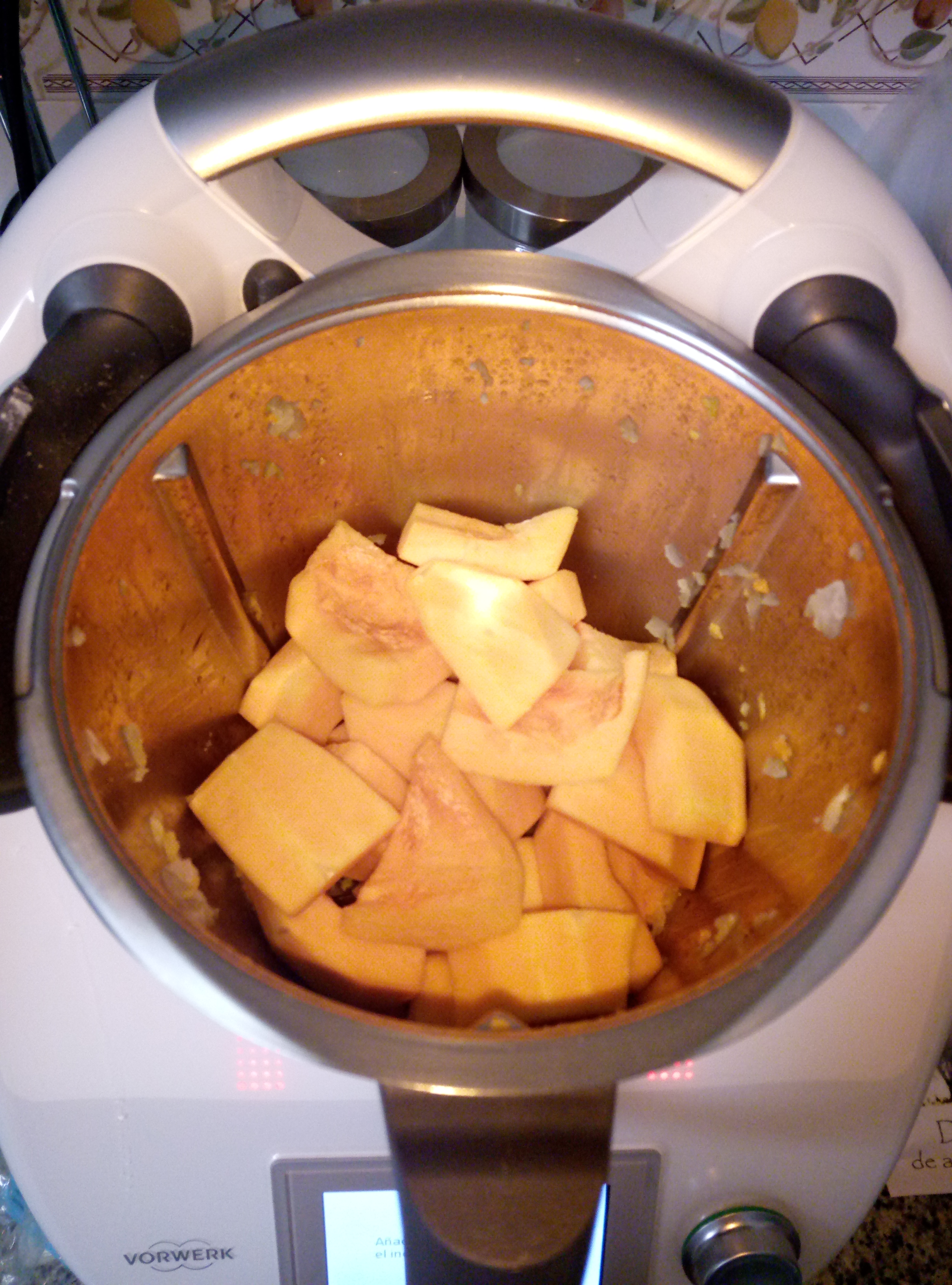 2. Añadimos la calabaza pelada y en trozos y trituramos 5 seg/vel 5 y volvemos a poner 5 min/120º/vel 1.