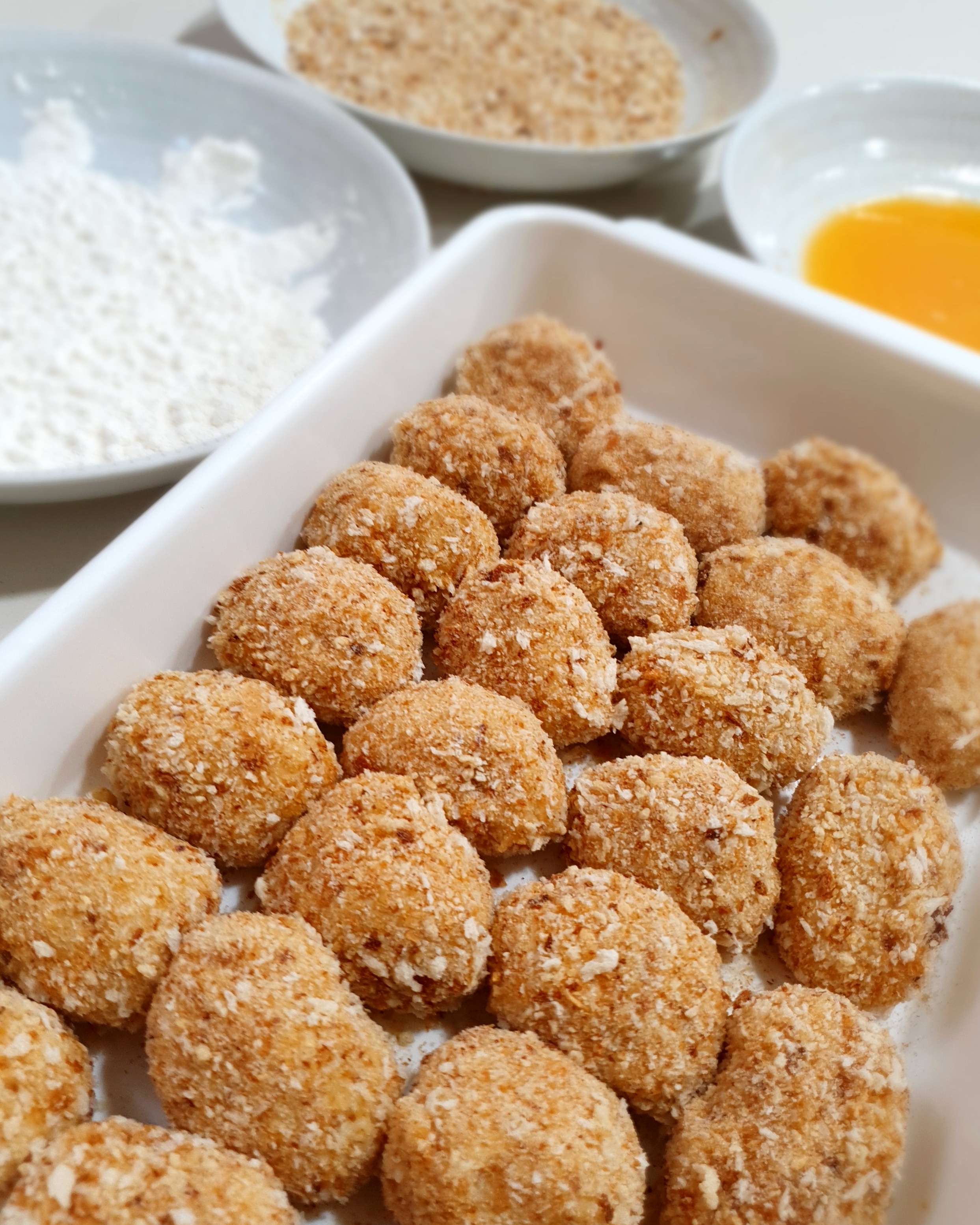 8. Forma les croquetes (*) i arrebossa amb farina blanca, ou batut i pa ratllat.