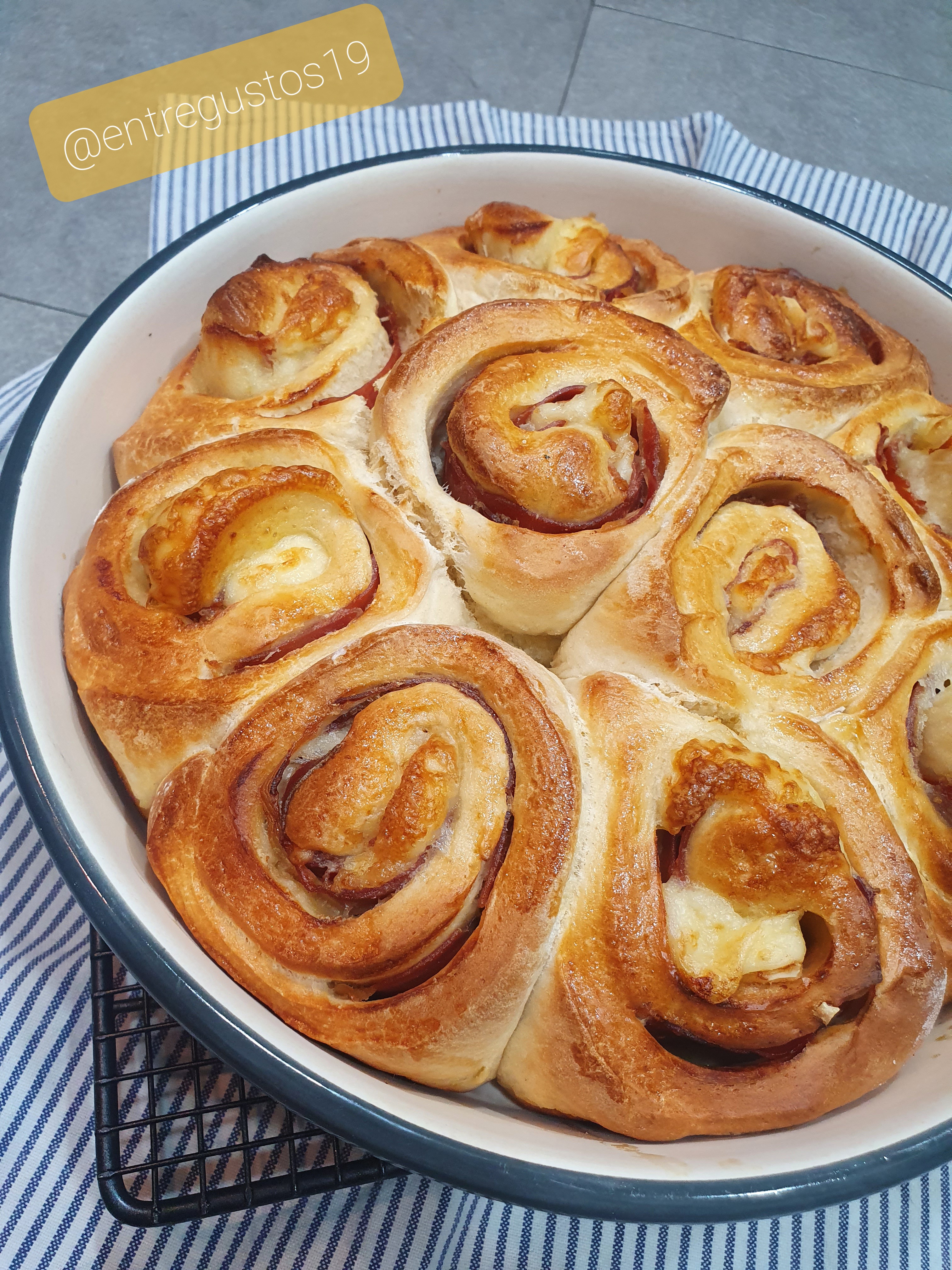 4. Amb un corró estirem la massa donant-li forma rectangular, aprox. 30x40cm. Cubrim la superficie amb els talls de pernil i el formatge. Formem un rotlle començant per la part més ampla. Tallem en 8 o 9 talls i col·loquem en el motlle preparat. Pintem la superficie amb l'ou batut.