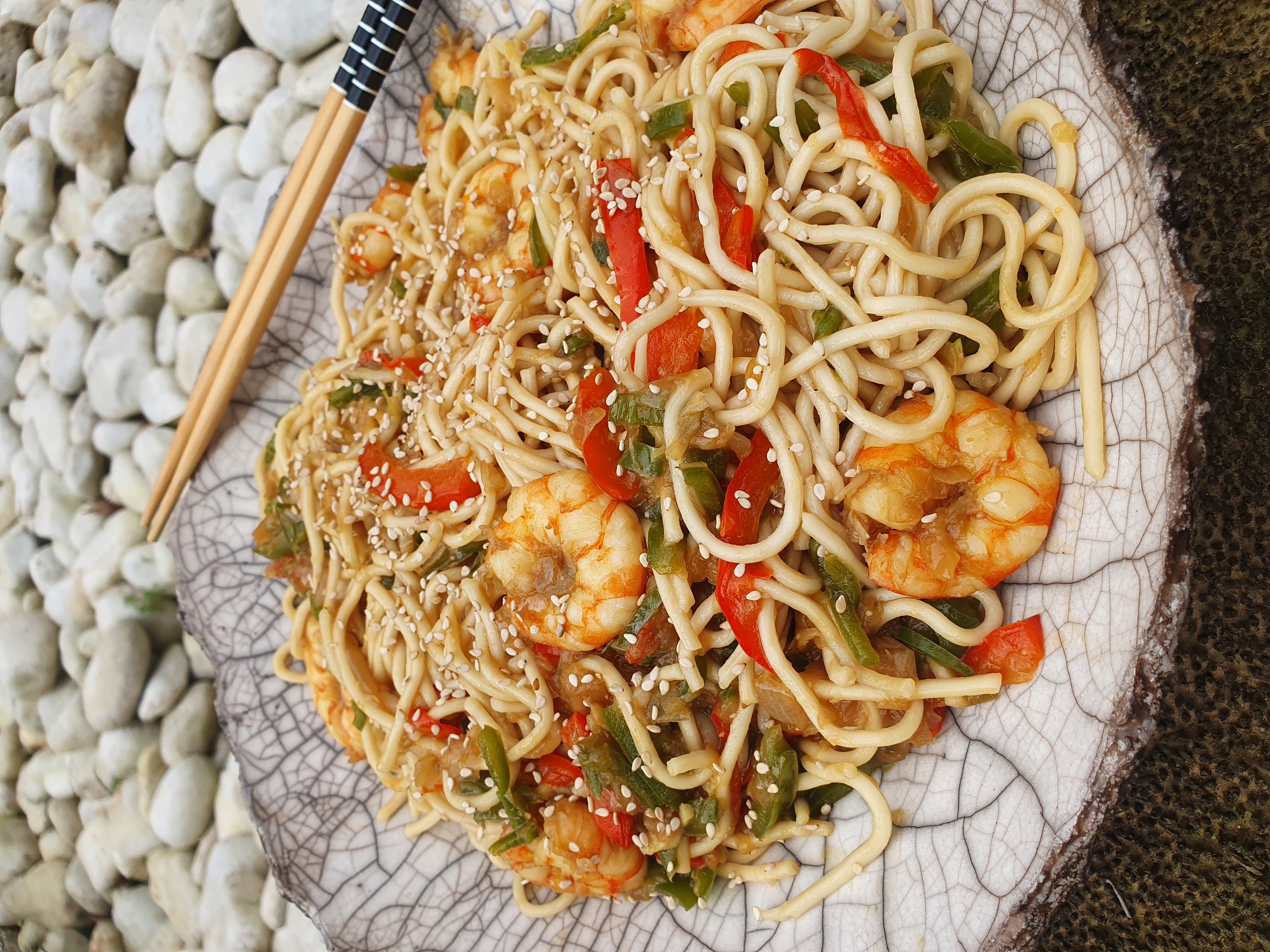 7. Posa els fideus en una safata per servir, aboca-hi el contingut del vas a sobre i barreja bé. Espolvoreja amb les llavors de sèsam... i bon profit!!