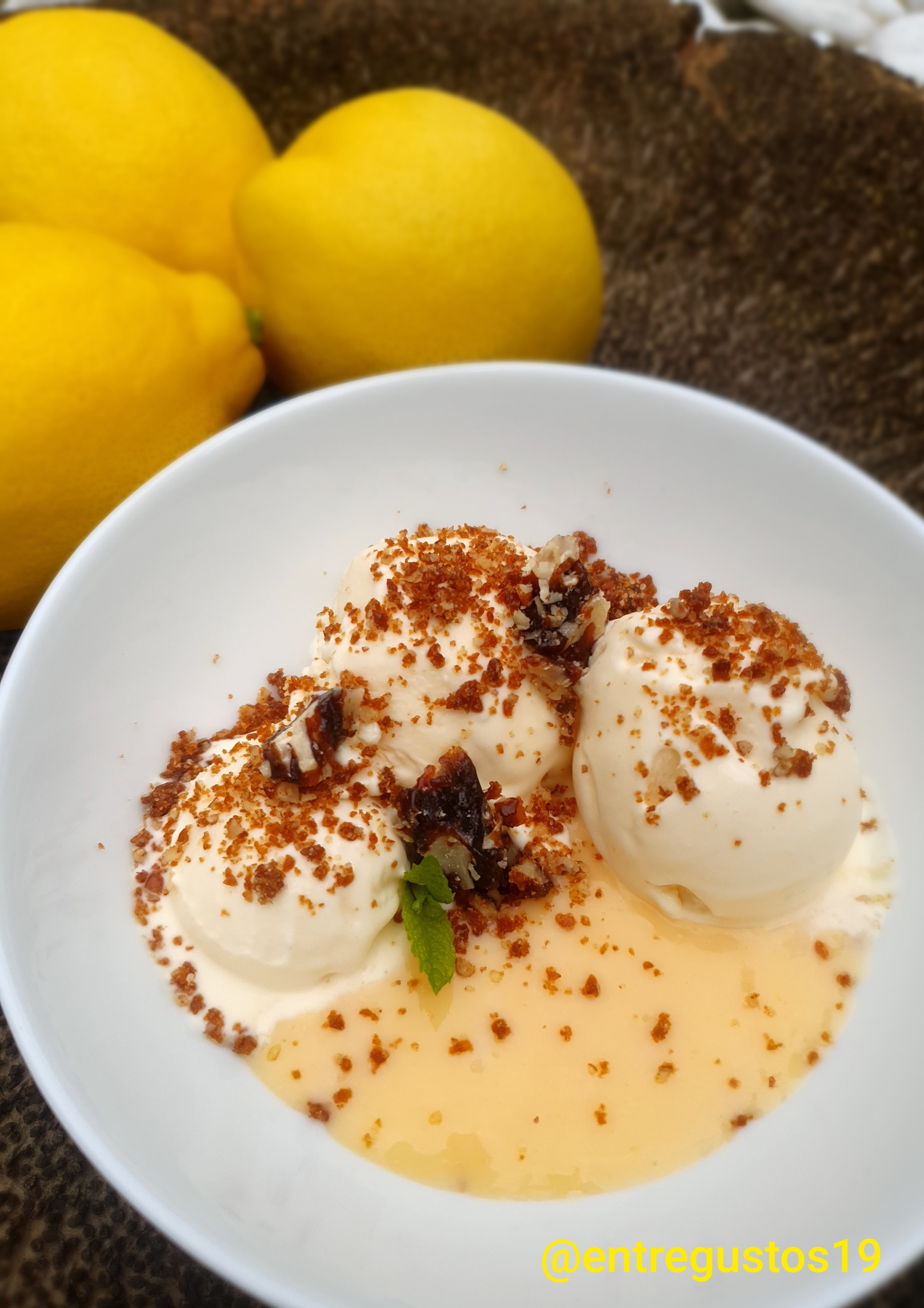 7. Fem boles amb una cullera de gelat i servim en un plat juntament amb una mica del lemon curd restant i nous caramelitzades.