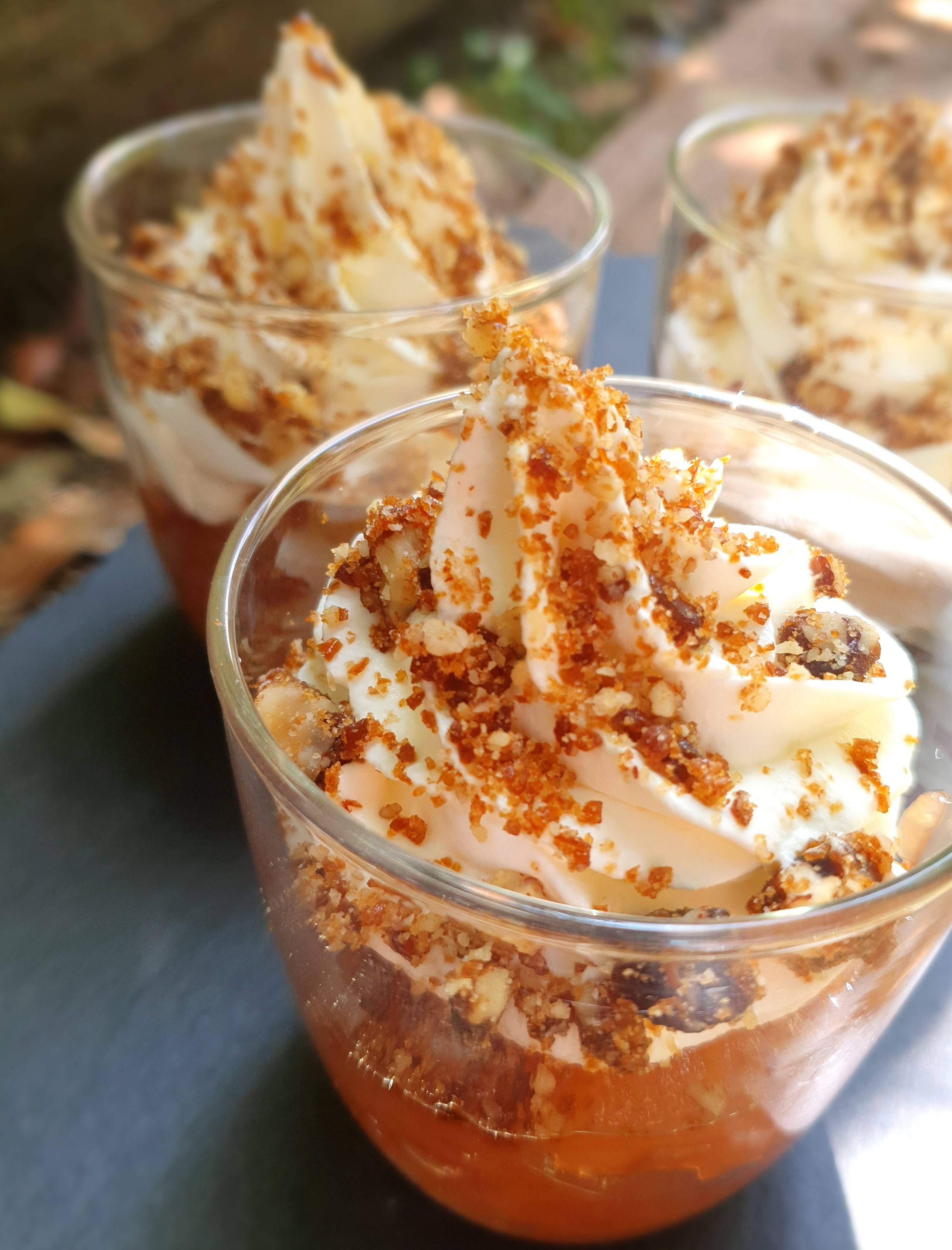 Pel muntatge del postre, omplim uns gotets amb la poma freda, hi posem la nata i espolvorejem amb el crocanti.