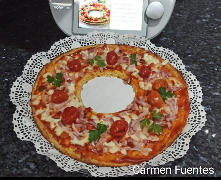 Está corona o pizza no lleva harina y está hecha con coliflor y almendra molida ,el resultado es espectacular. Luego el relleno es a nuestro gusto.