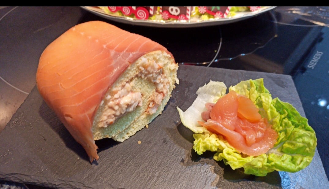 Cubra el brazo de gitano con una capa fina de mayonesa y coloque encima las lonchas de salmón. Corte en rodajas y sirva.