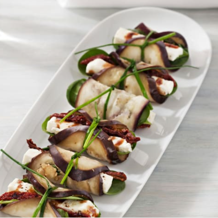 ROLLITOS DE BERENJENA CON QUESO FETA Y TOMATES SECOS EN ACEITE