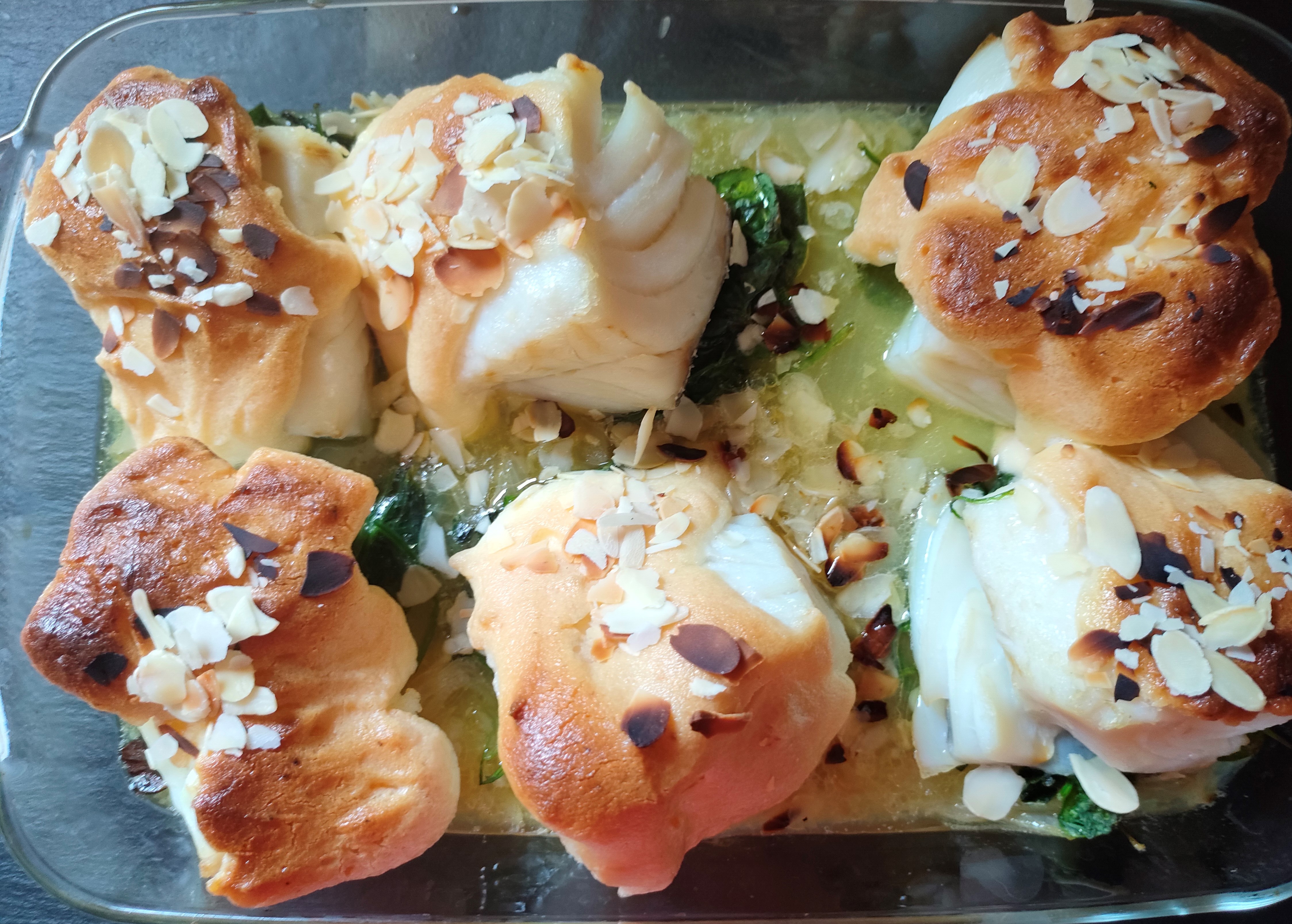Hornear el bacalao durante 5-10 minutos (200°C). Retire del horno. Mirar que no se queme las láminas de almendra