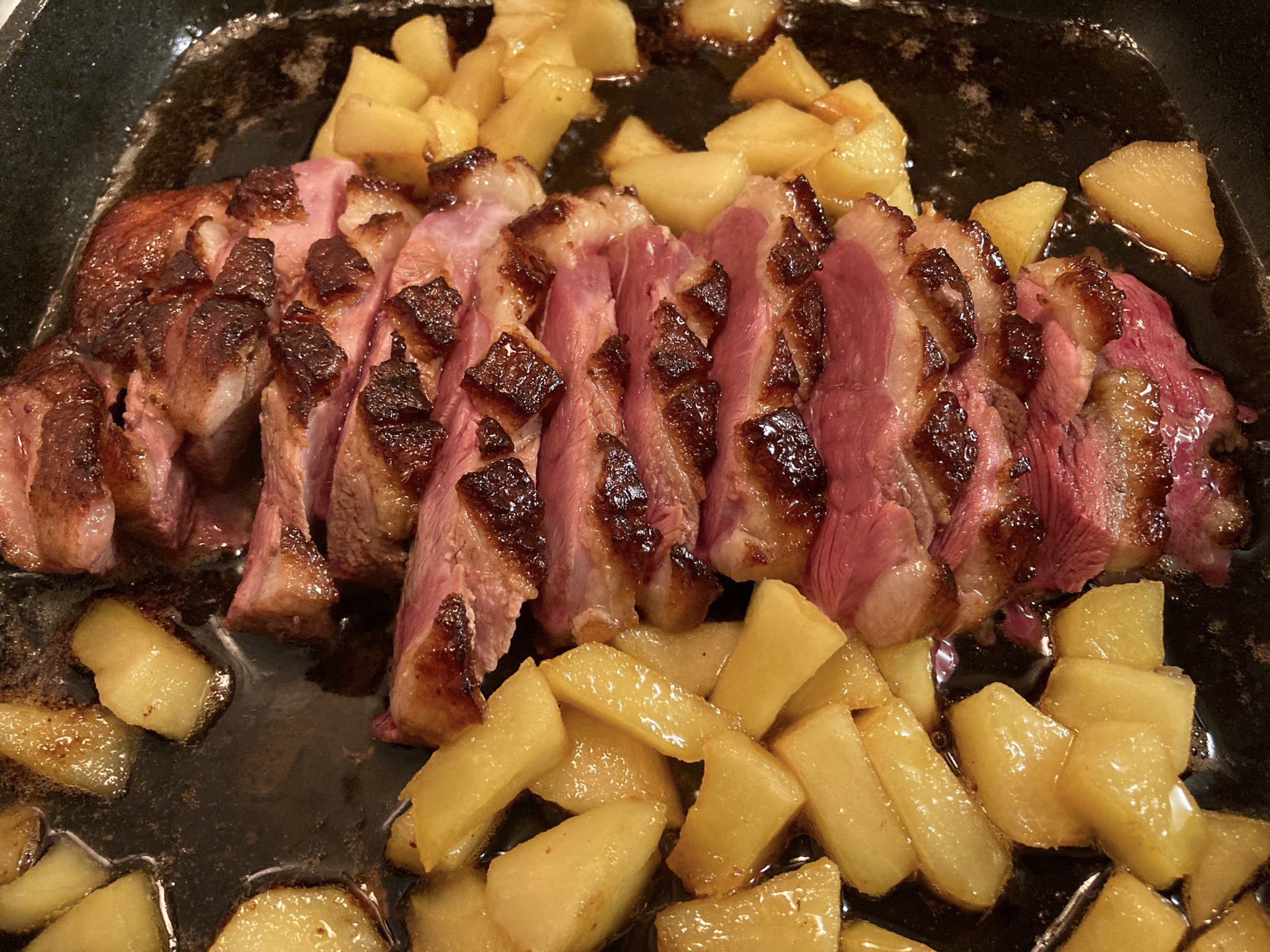 Hoy una comida sencilla y con toque gourmet. La he hecho adaptando Magret de pato con salsa mirin y Saltear 200 g de manzana a alta temperatura dos recetas que puedes encontrar en Cookidoo, (la manzana dorada es de francia, quitar el filtro españa y poner francia)