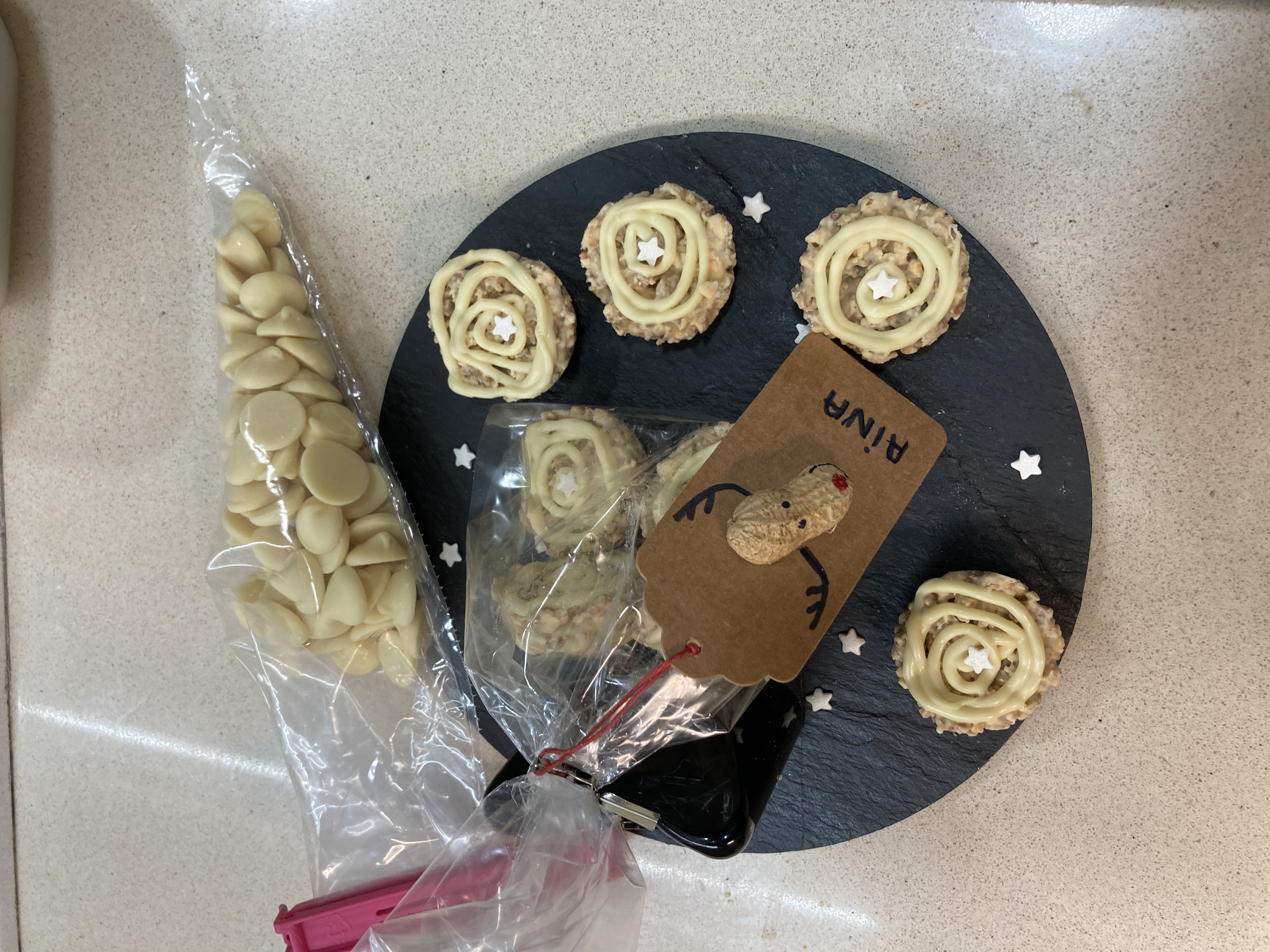 - Dibujad una espiral sobre las galletas, empezando desde el centro haciendo un pequeño corte en la punta de la manga pastelera