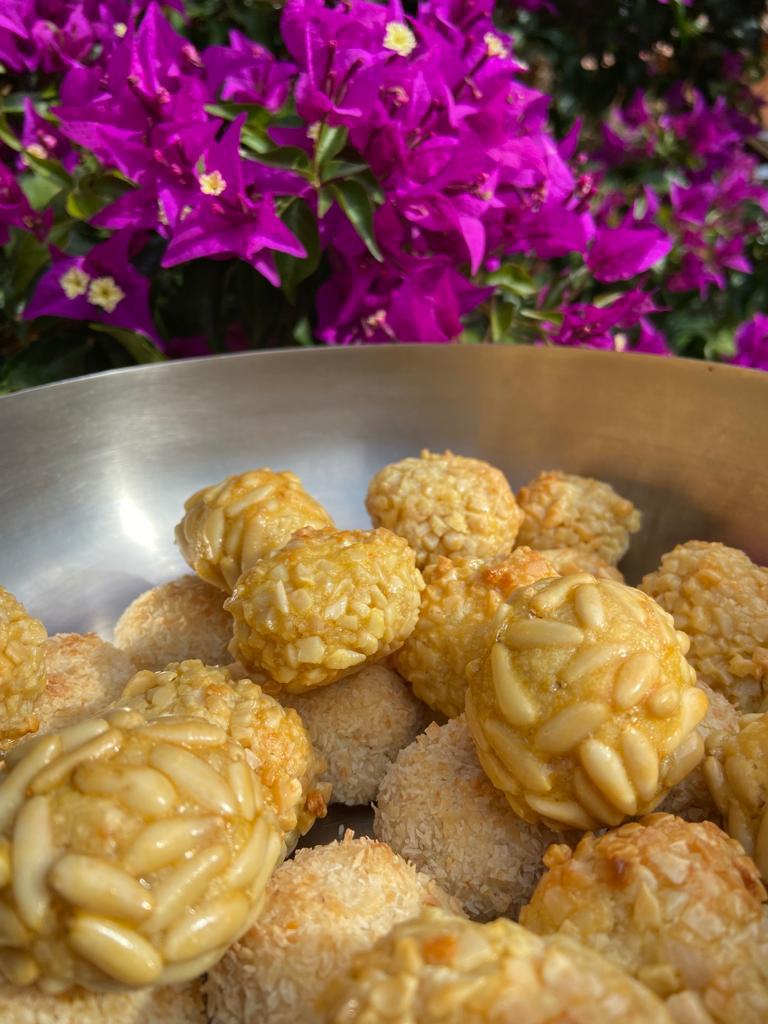 - Incorpora els pinyons al rovell, i en una safata arrebossa les boles per fer panellets.