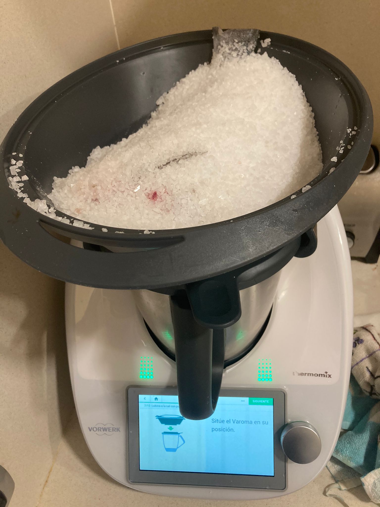 - Coloque el recipiente Varoma sobre su tapa colocada boca arriba para no manchar la encimera y cubra el fondo con sal gorda. Lave y seque muy bien la lubina con papel de cocina y colóquela entera, con vísceras y escamas, encima de la sal. Cubra con sal, tapando totalmente y presionando con las manos para que la sal quede compacta. Tape el recipiente Varoma y reserve.
