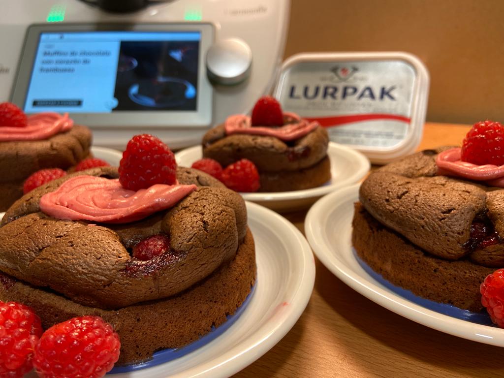 Muffins de chocolate con corazón de frambuesa. La he elaborado modificandola en algunos puntos: