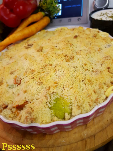 4. Pon en el vaso la harina, la mantequilla y los anacardos y mezcla 20 seg/vel 4. Reparte el crumble sobre las verduras en la fuente y hornea durante 30 minutos (180° C). Mientras tanto, lava vaso y prepara la salsa.