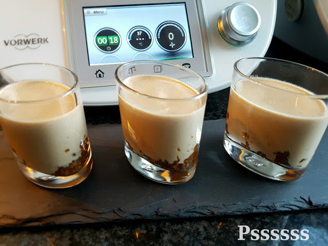 2. Añade el azúcar moreno, el Oporto y la canela y, sin poner e| cubilete, programa 15 min/100°C/vel cuchara. Pon en cada vaso 1 cucharada de compota y retira el resto del vaso. Lava el vaso.