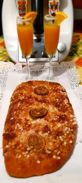7. Vuelca nuevamente la masa sobre una encimera enharinada divide la masa en 2 y dales forma de chusco o coca estira con un rodillo desde el centro hacia los extremos, coloca en una bandeja de horno, presiona la masa con los dedos para hacer leves endiduras en la coca, espolvorea con azucar blanca generosamente, distribuje la fruta confitada encima del azucar.