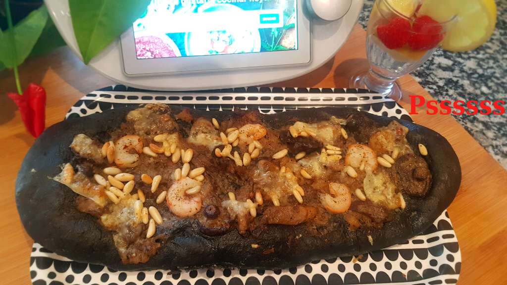 COCA NERO DI SEPIA CON ROVELLONS, GIRGOLAS, GAMBAS Y LASCAS DE IDIAZABAL EN THERMOMIX ®