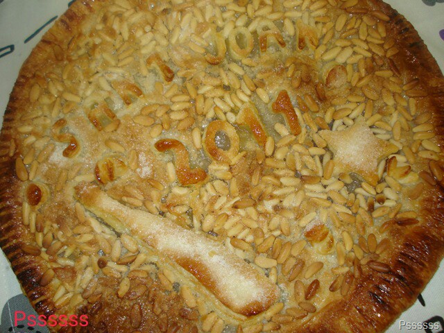 5. Cubre la masa con la otra placa de Hojaldre, cierrala con un tenedor y pinchala para que no suba, píntala con huevo batido, escurre los piñones, repartelos sobre ella y espolvorea con azúcar generosamente otra vez.