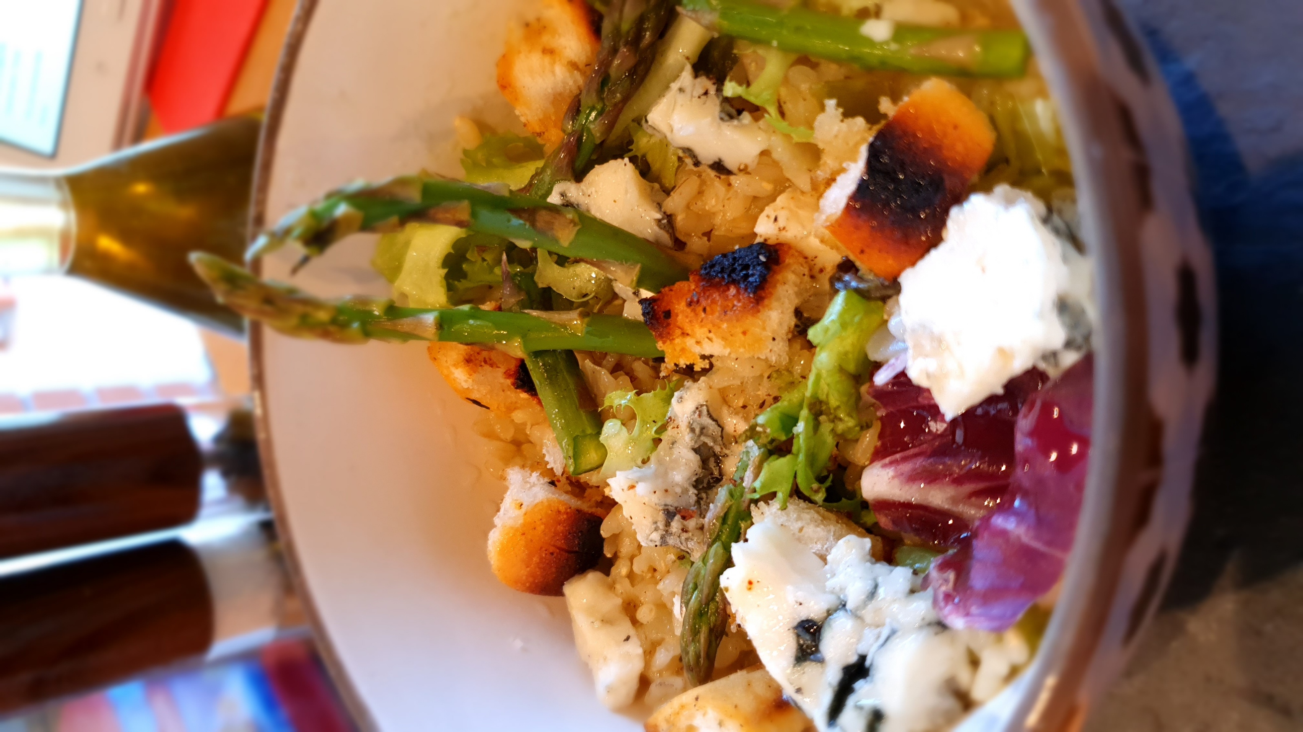 3. Con la muesca de la espátula extraiga el cestillo y vierta el arroz sobre el sofrito reservado. Incorpore las espinacas, las puntas de espárragos, el queso y el pan de molde tostado. Salpimiente la ensalada y sirva templada.
