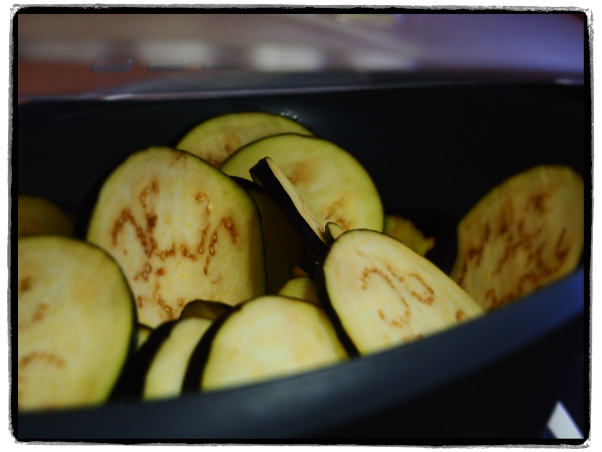 Este tomate va a estar durante unos 30-40 minutos a temperatura varoma velocidad 1 en nuestro Thermomix, así que vamos a aprovechar esta fantástica ocasión para cocinar las rodajas de berenjena necesarias para hacer el mil hojas en el recipiente Varoma.
