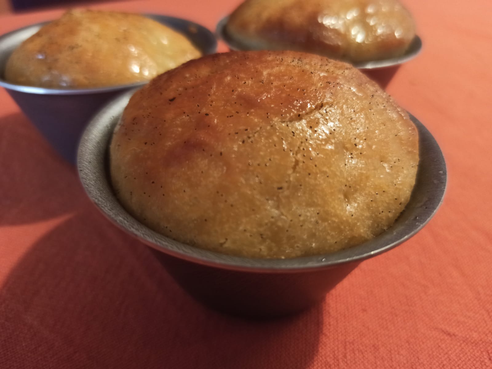 5-Poner de nuevo en el horno, SIN bandeja de vapor, con aire si tenéis, sino arriba y abajo a una temperatura de 180 ºC durante unos 10 minutos. Según el grosor de la bolita que hayáis hecho inicialmente puede que sea necesario poner un poco más de tiempo de horneado. Lo sabréis pinchando como cualquier bizcocho. En mi horno, ha estado un total de 25 minutos. Las flaneritas, han estado, en los 10 minutos estipulados.