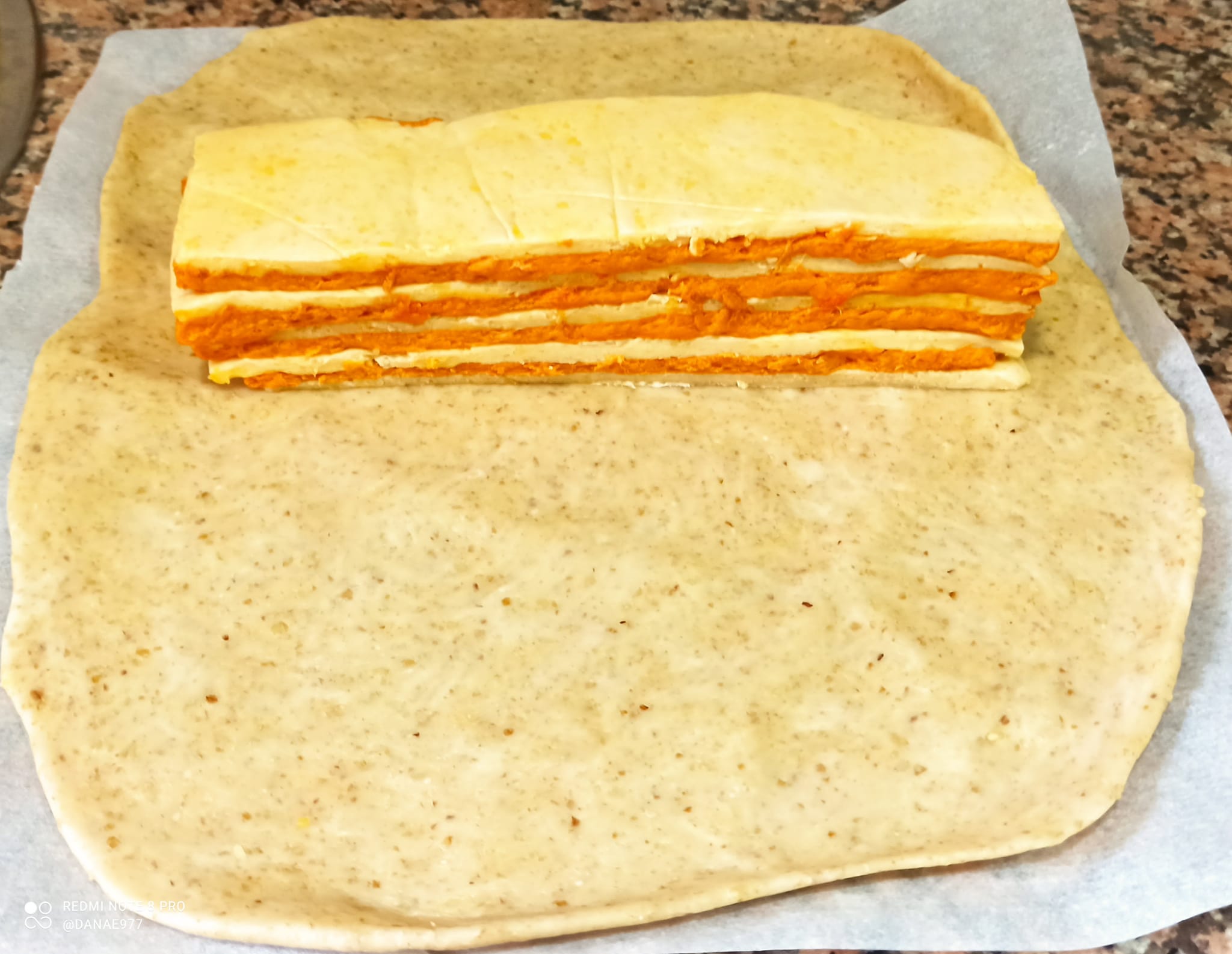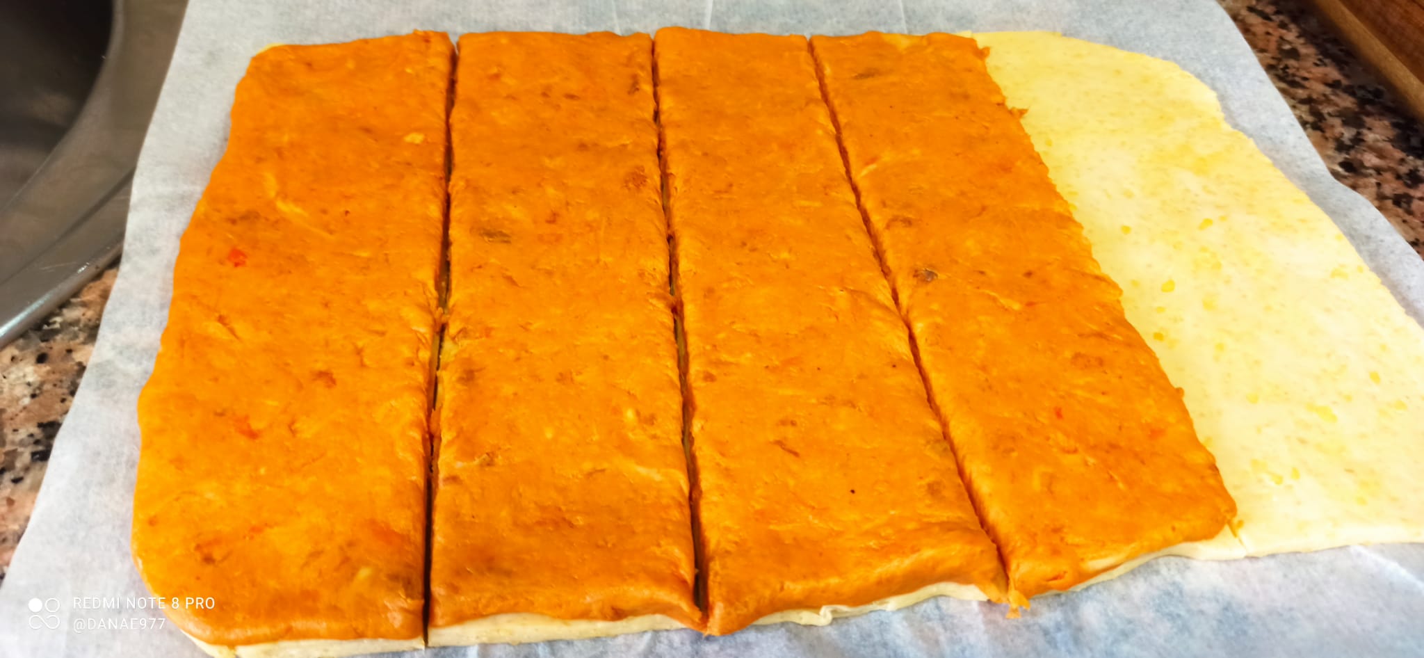 Recomiendo estirar las masas sobre una hoja de papel de hornear ya que así luego es más fácil de manipular y sobretodo "casar" con la otra. Hacemos 5 cortes (como en la foto), de la lámina de sobrasada sólo 4.