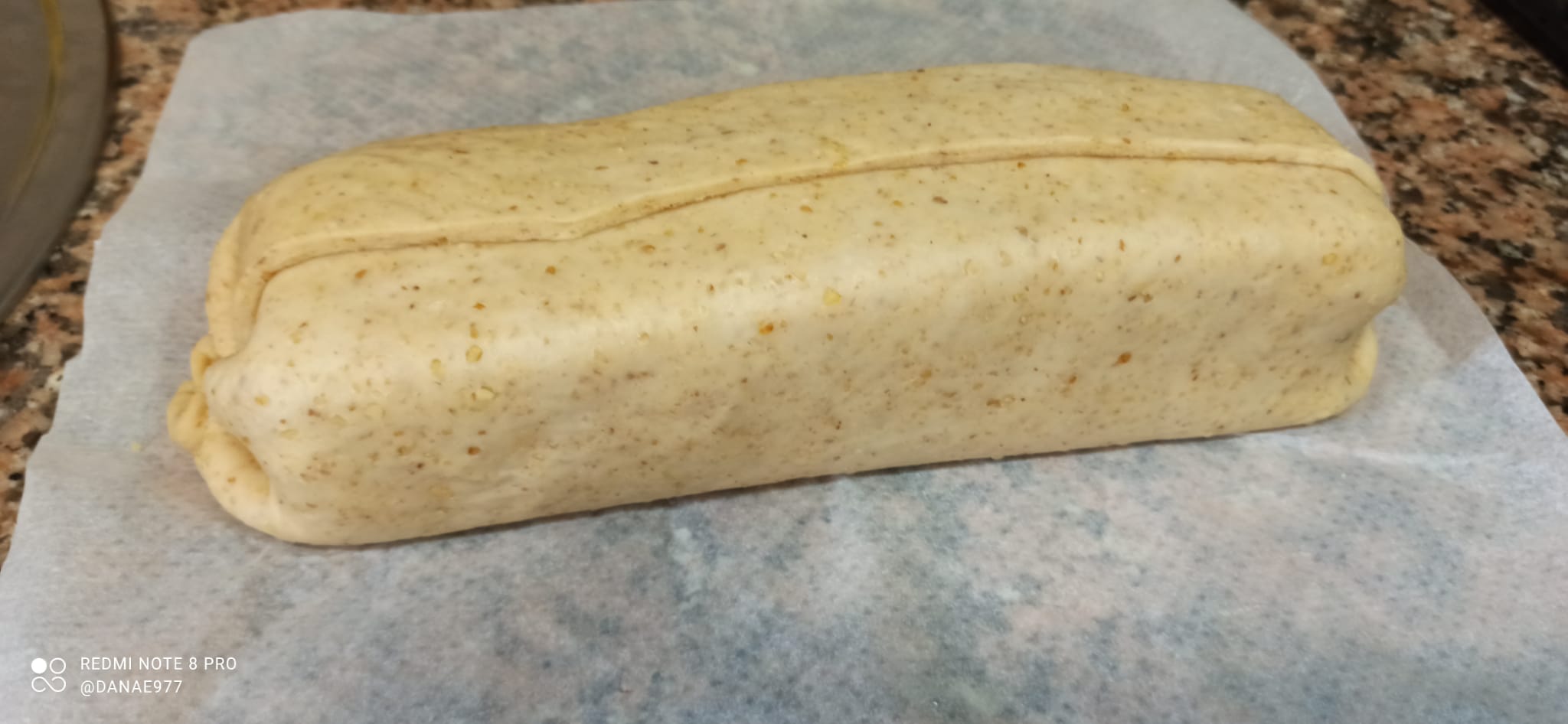-Coger la primera masa y ponerla en el vaso. Añadir las nueces y amasar a velocidad espiga durante 1 minuto. Retirar del vaso y envolver con papel film.