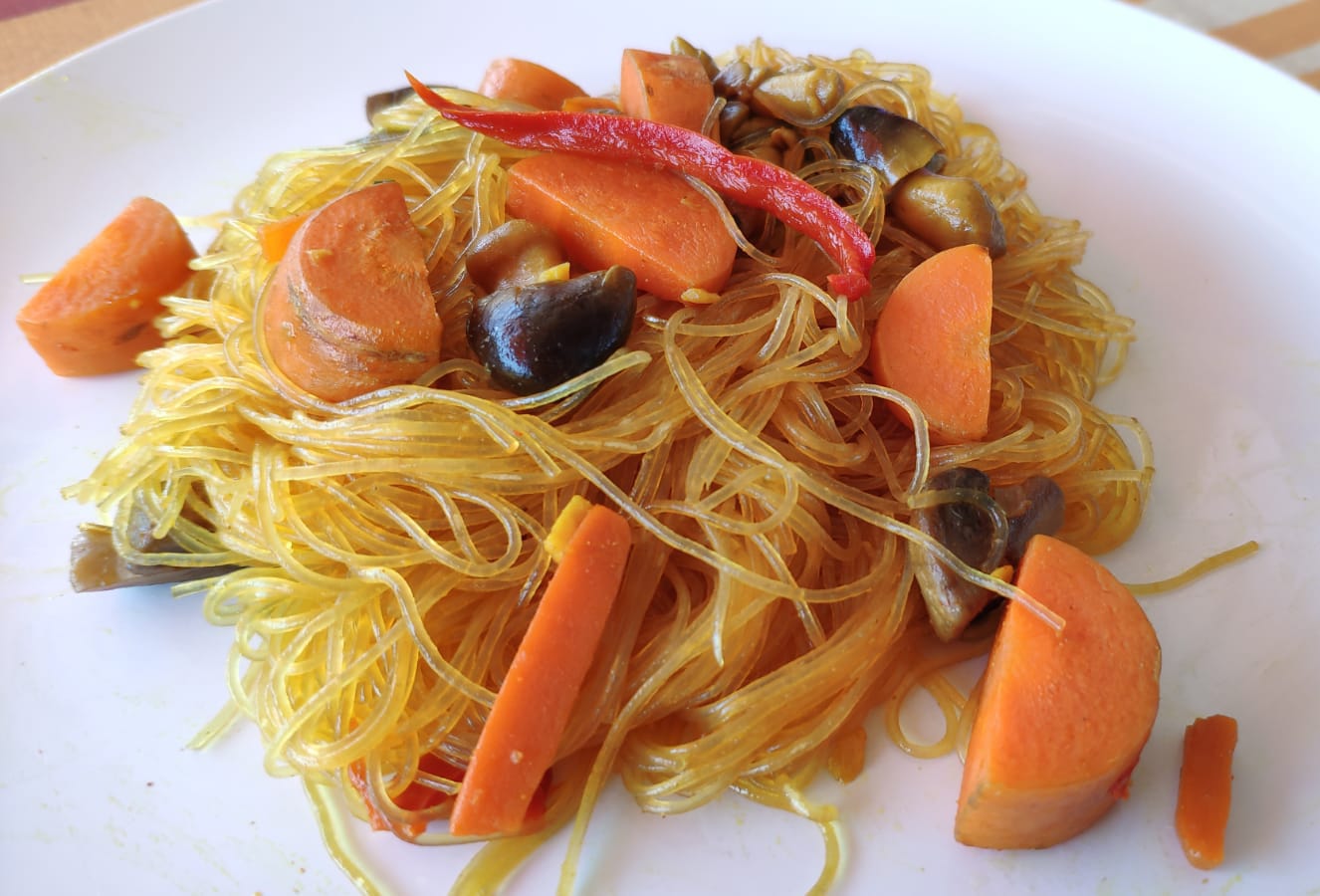 Estos días estamos buscando en casa sabores nuevos y exóticos. En el libro de Oriente que encontramos en Cookidoo hay ésta fantástica receta de fideos filipinos (Pancit). Eso sí hoy la hemos tuneado un poquito. La hemos hecho vegetariana al evitar el pollo y le hemos puesto unas negrillas (fredolics en catalán) en conserva para acabar de complementar. También podríamos haber puesto otro tipo de setas, tipo shitake, pero son las que teníamos.
