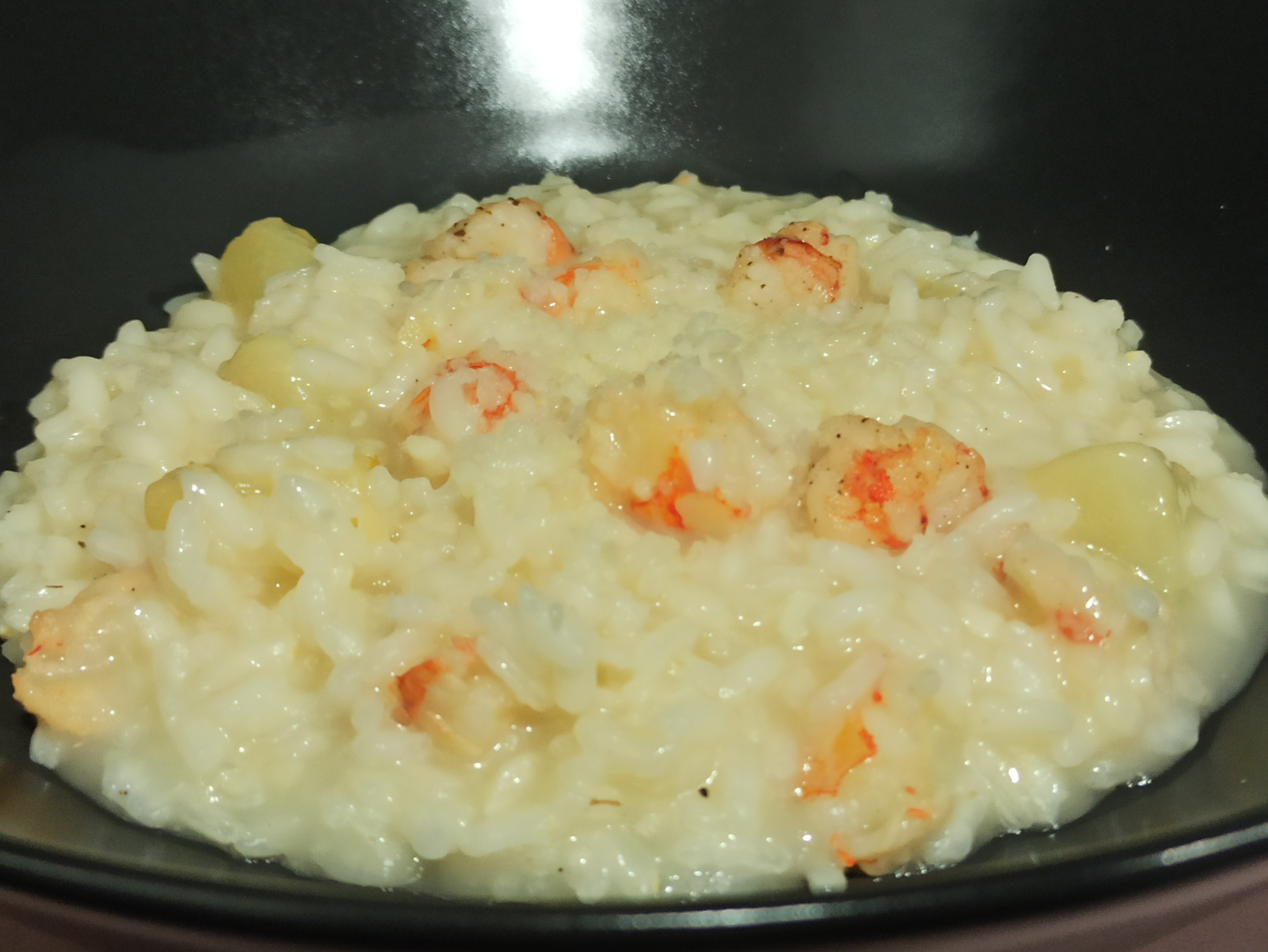 me encantan los risottos, y me encanta tunear los risottos. Basándome en la receta de gambas, salchichas y manzana, he hecho un risotto con pera conference que tenía en casa y unas gambas langostineras que tenía congeladas. Además, el día anterior había hervido judías verdes con mi thermomix y tenía el agua guardadita.