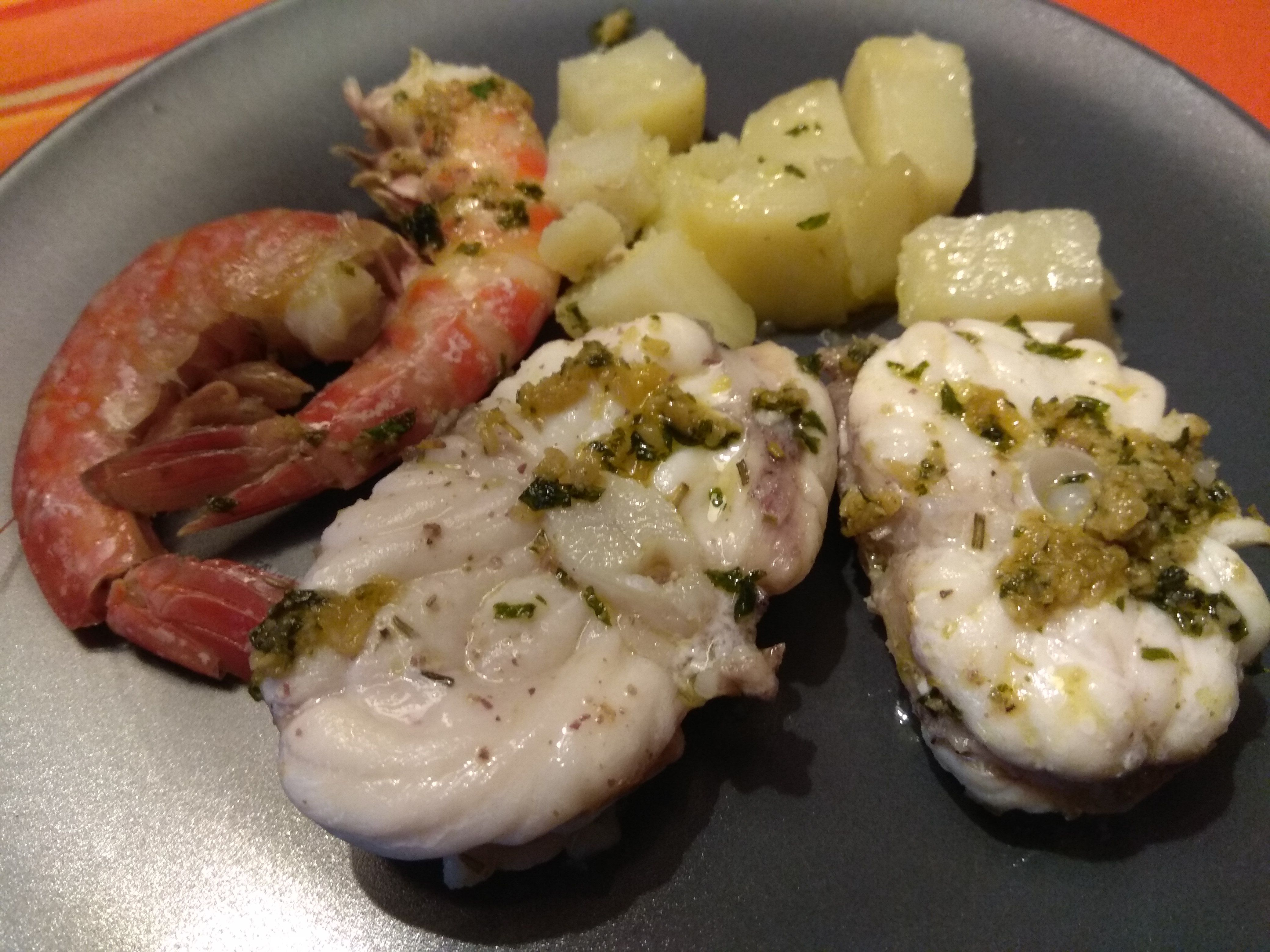 El primer plato que hacemos con nuestra compra es un delicioso rape con gambones y patatas al ajillo. Sencillo y muy saludable ya que lo haremos con el varoma y en poco tiempo lo tenemos en la mesa.