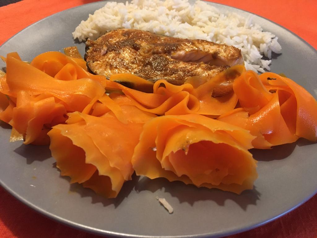 Mirando en mi cookidoo he encontrado esta receta de salmón con arroz basmati. Nos pide en los ingredientes pasta de curry Tikka. Yo no disponía de dicha salsa pero sí de un curry masala (picante) que traje de mi último viaje a la India (país que me apasiona). Y he querido probar cómo quedaba emulsionado con un poco de aceite de oliva. La verdad, ha quedado muy rico. Es una receta muy sencilla, muy hipocalórica ya que no ponemos grasas adicionales en el plato (a parte de mi emulsión) y tal cómo os comentaba muy saludable.