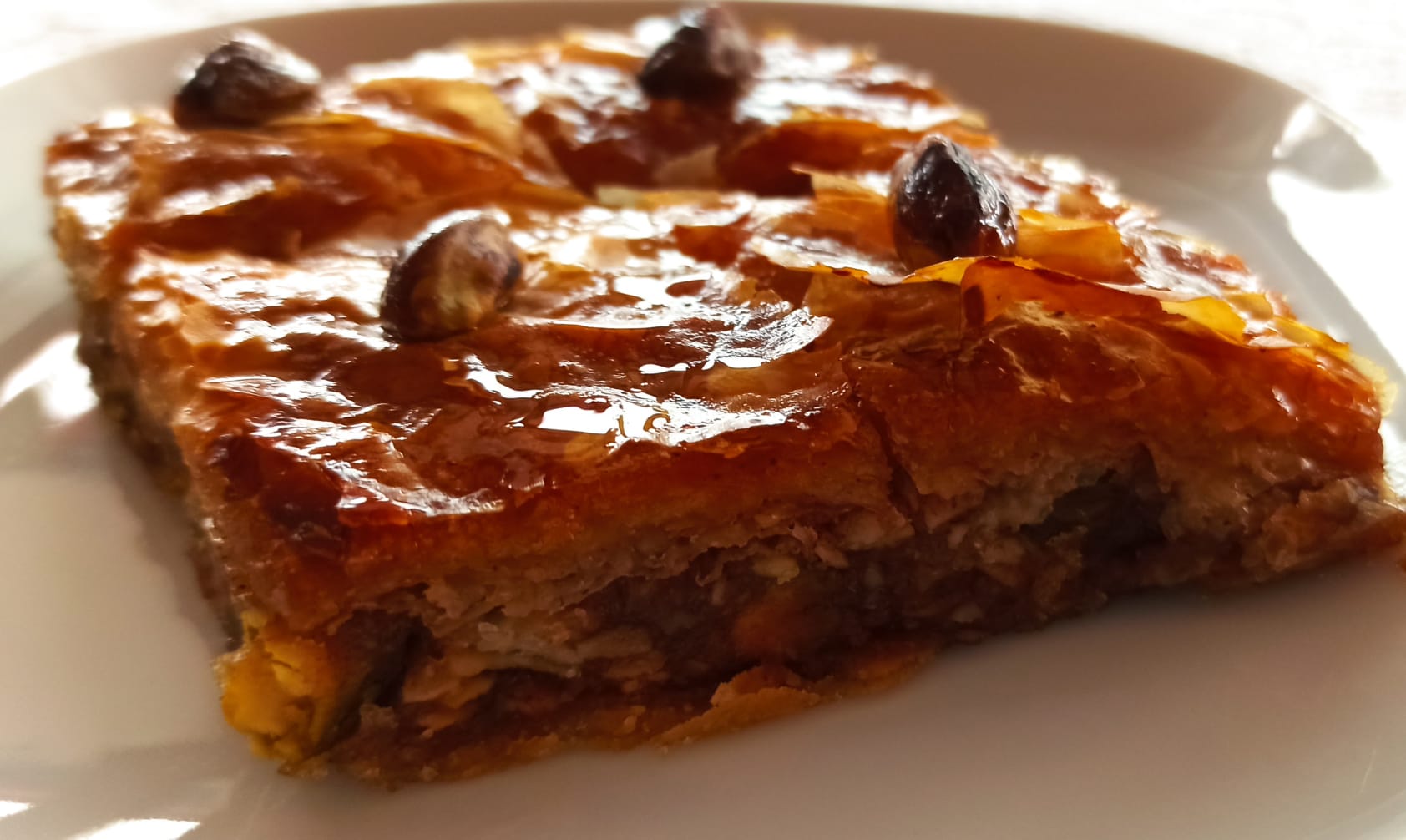 Receta, como he dicho antes, entretenida. Buscar miniayudantes con un buen pincel de cocina y ponerlos a pintar entre capa y capa, se lo pasarán en grande. Al mordisco es un dulce muy jugoso ya que las capas de masa con la miel quedan impregnadas y para nada seco..
