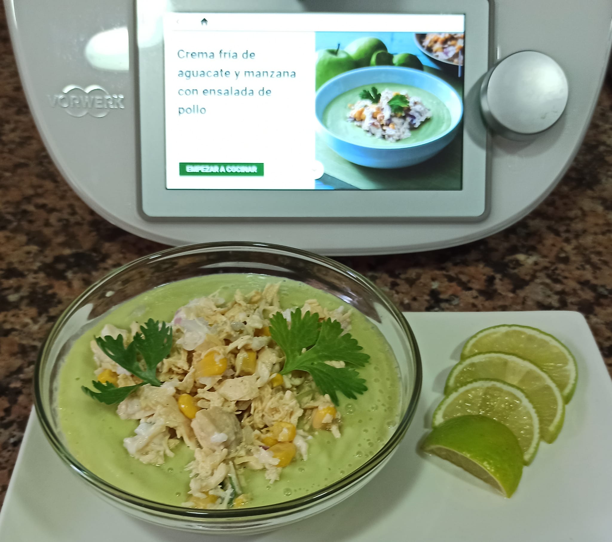 Seguimos con ideas para el veranito. Una receta fresca, saludable muy fácil de hacer es la que descubrí hace unos días preparando una de nuestras clases virtuales en nuestra plataforma Cookidoo (si te apetece asistir a alguna sólo me lo tienes que decir ;-)). Se trata de una "Crema fría de aguacate y manzana con ensalada de pollo" que me pareció fantástica.