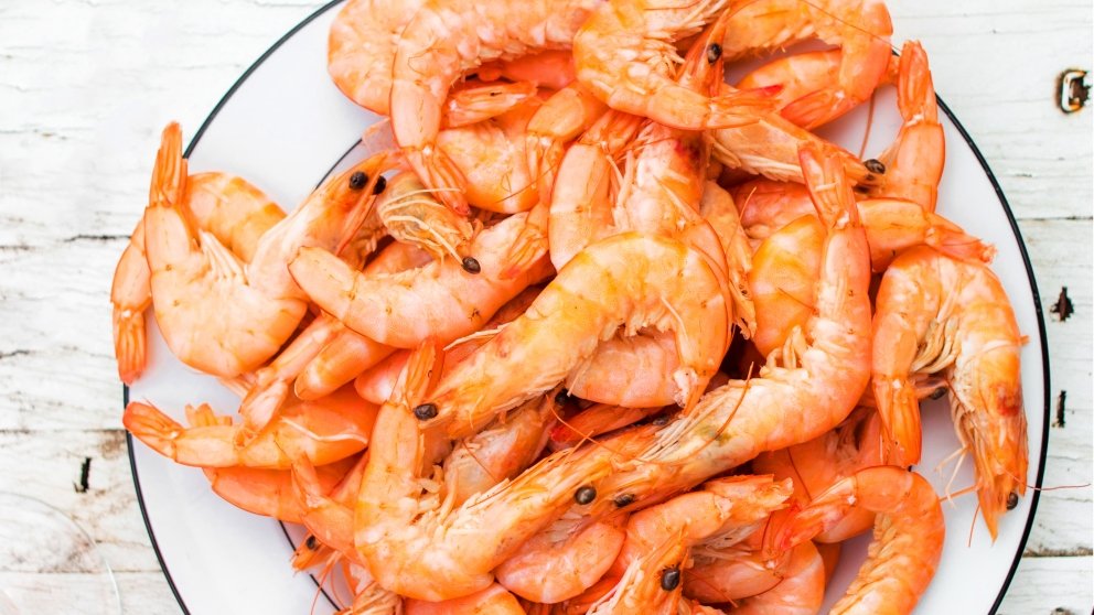 50 g de almendras tostadas sin sal, 2 ñoras (sin pedúnculo ni semillas), 1 - 2 pimientas de Cayena secas enteras, 130 g de aceite de oliva virgen extra (y algo más para regar), 100 g de cebolla en trozos, 2 dientes de ajo, 150 g de tomate triturado en conserva, 1000 g de langostinos cocidos, 20 g de vinagre, 3 pellizcos de pimienta negra molida, ½ cucharadita de sal y 1 - 2 cucharadas de perejil fresco picado
