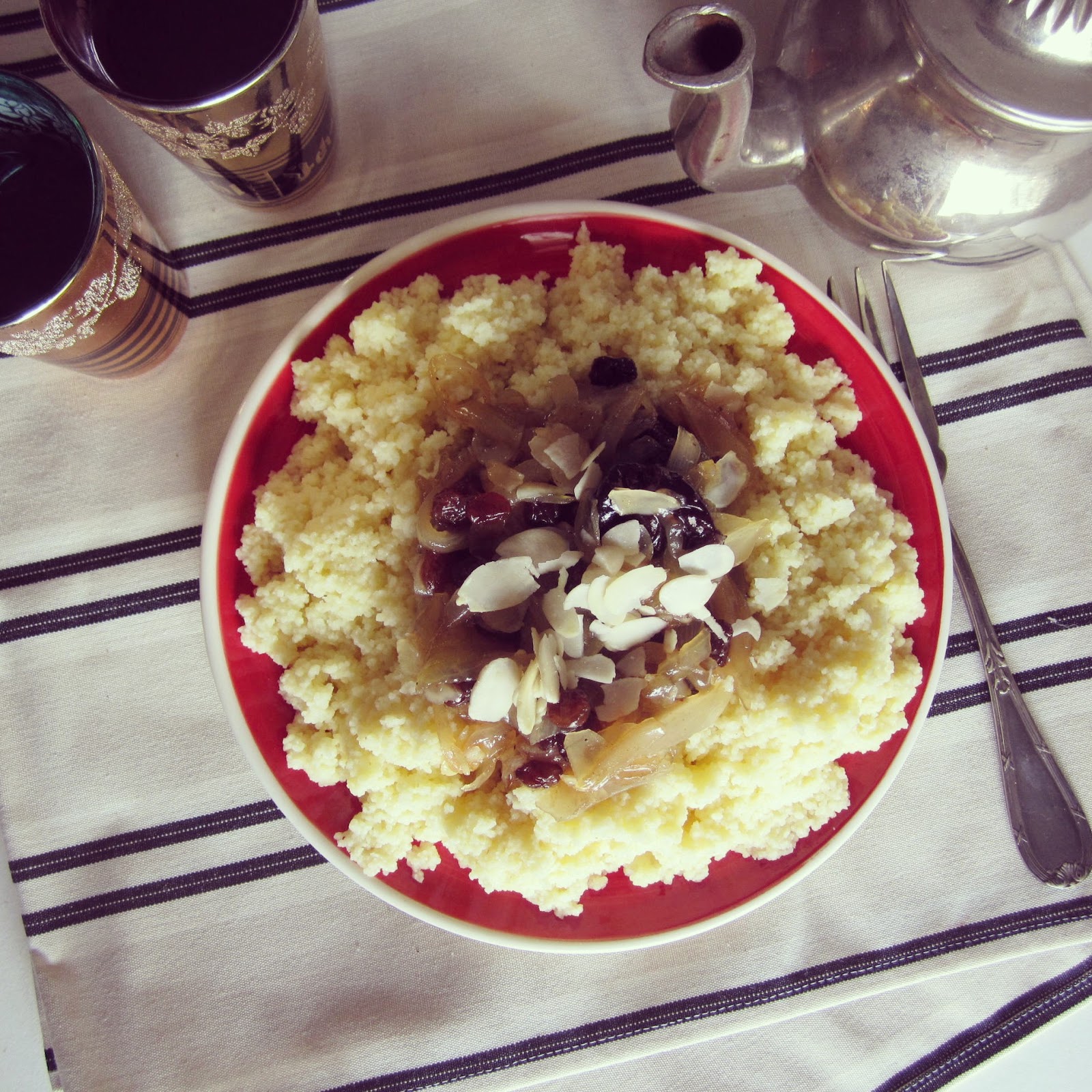 - Removemos el cuscús con un tenedor para que no queden grumos y añadimos la cebolla reservada. Decoramos con almendras u otros frutos secos