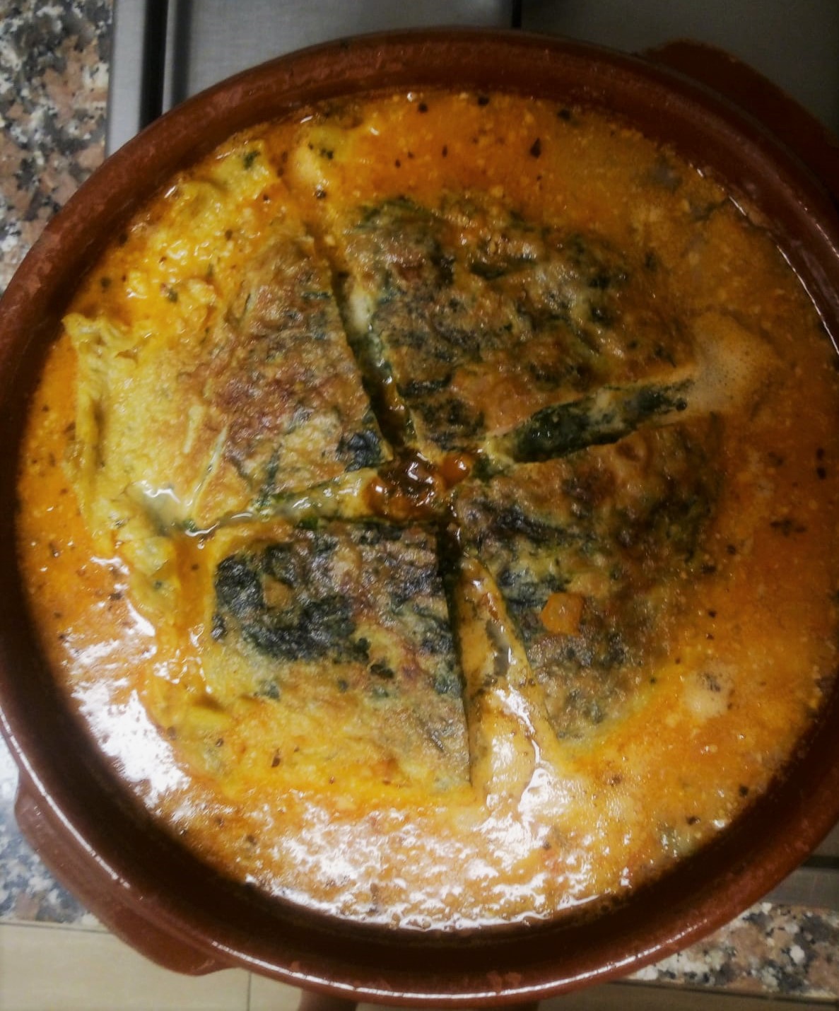 Entre diciembre y febrero, época de la recogida de la oliva, era cuando se elaboraba este plato. Al volver de trabajar con las manos heladas soñaban con un plato caliente. La tortilla ya estaba cuajada del día anterior, solo tenían que hacer un sofrito, después metían de nuevo la tortilla en la cazuela y la cubrían de agua. Era la manera de tomarla caliente. Las espinacas para esas fechas, estaban en su máximo esplendor y eran fáciles de obtener. ¿Vamos a cocinar?
