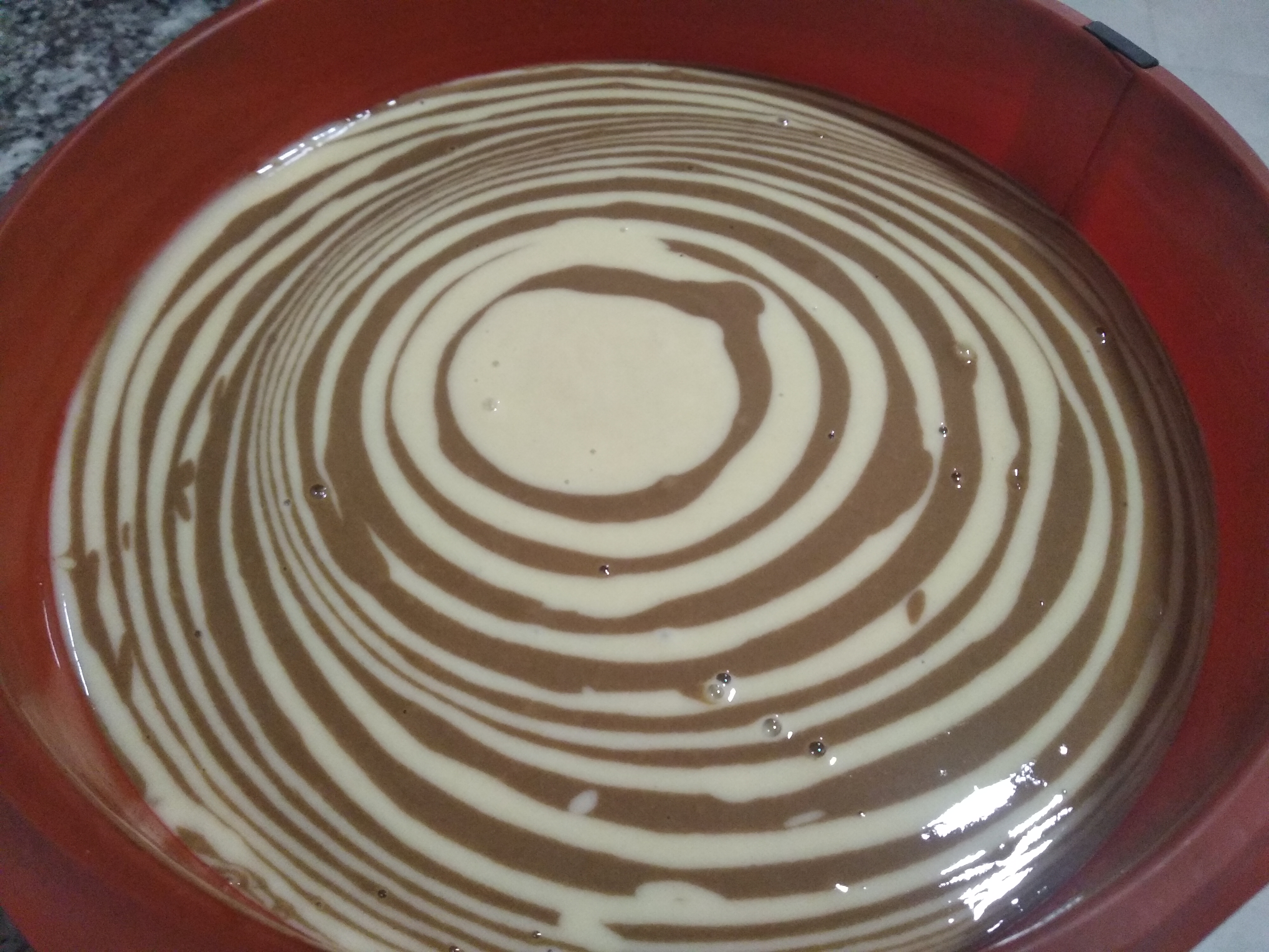 Con las mangas, vaya vertiendo las masas en el centro del molde, alternando los colores, hasta acabar con las 2 masas (los primeros círculos tienen que tener mayor diámetro).