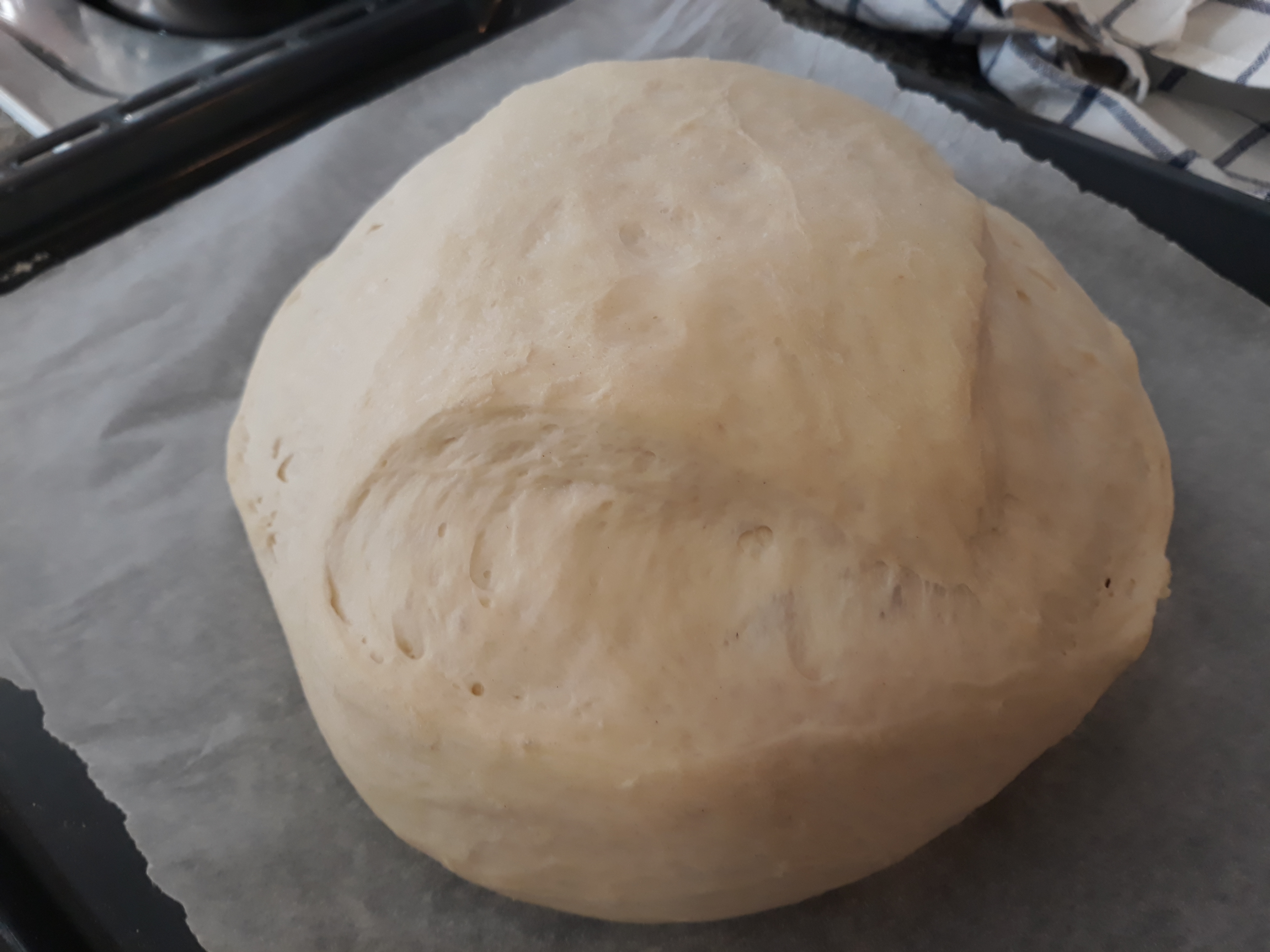 Ponga la masa sobre la superficie de trabajo enharinada y forme una bola lisa y tensionada. Coloque la masa sobre la bandeja del horno engrasada (o cubierta con papel de hornear). Deje que doble su volumen, haga unos cortes de 1cm de profundidad formando un cuadrado con un cuchillo muy afilado o con unas tijeras y espolvoree con harina.