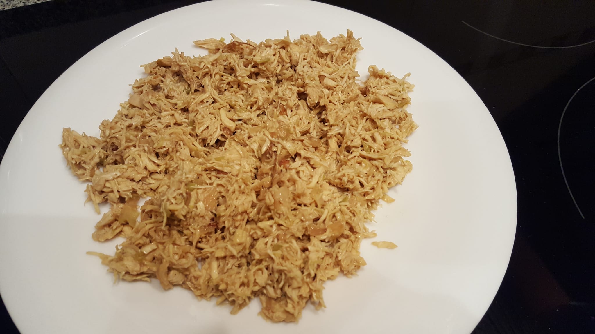 Añade la pechuga de pollo (asegúrate que queda bien distribuida dentro del vaso) e inicia Alta Temperatura . Después, deshilacha 4 seg/giro inverso/vel 4. Sazona al gusto y sirve inmediatamente o utiliza a tu conveniencia.