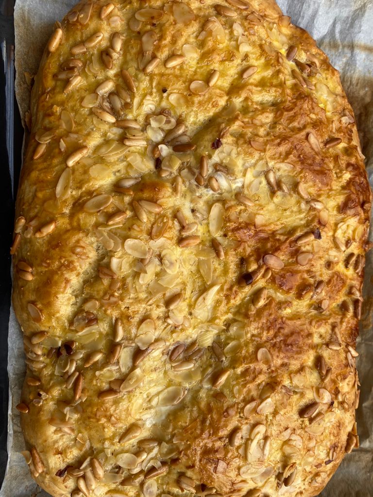 - Añadiremos 2 yemas de huevo y mezclaremos 4 segundos a velocidad 3. Retiraremos la mariposa y terminaremos de mezclar con la espátula. Verteremos la mezcla sobre la coca, extendiéndola por toda la superficie y espolvorearemos con 4-5 cucharadas de almendras laminadas, 3-4 cucharadas de piñones y 4-5 cucharadas de azúcar