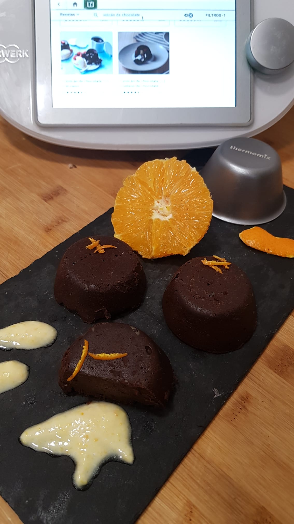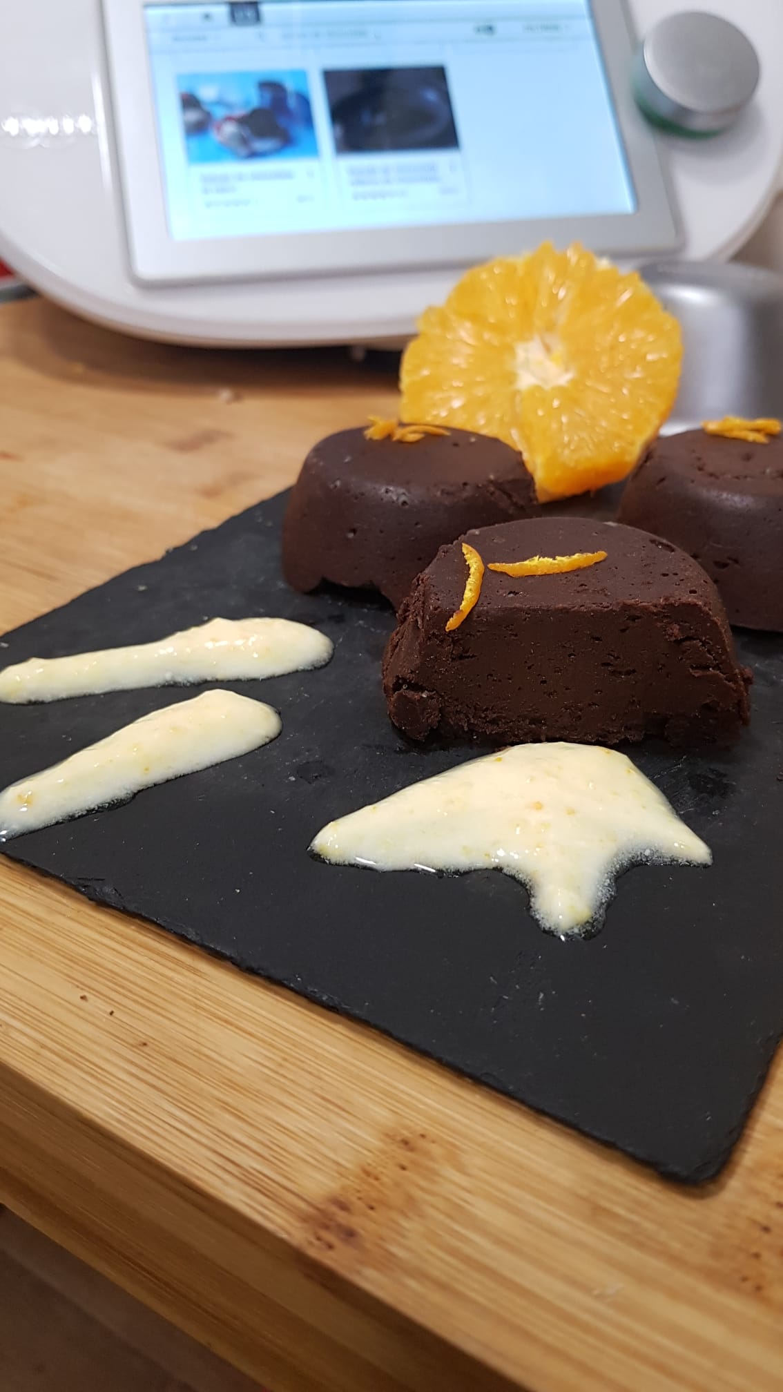 Ponga en el vaso el chocolate en trozos y 50 g de aceite de oliva y funda 2 min/70°C/vel 1. Mientras tanto, pincele el interior de 4 flaneras individuales desechables de aluminio con aceite.