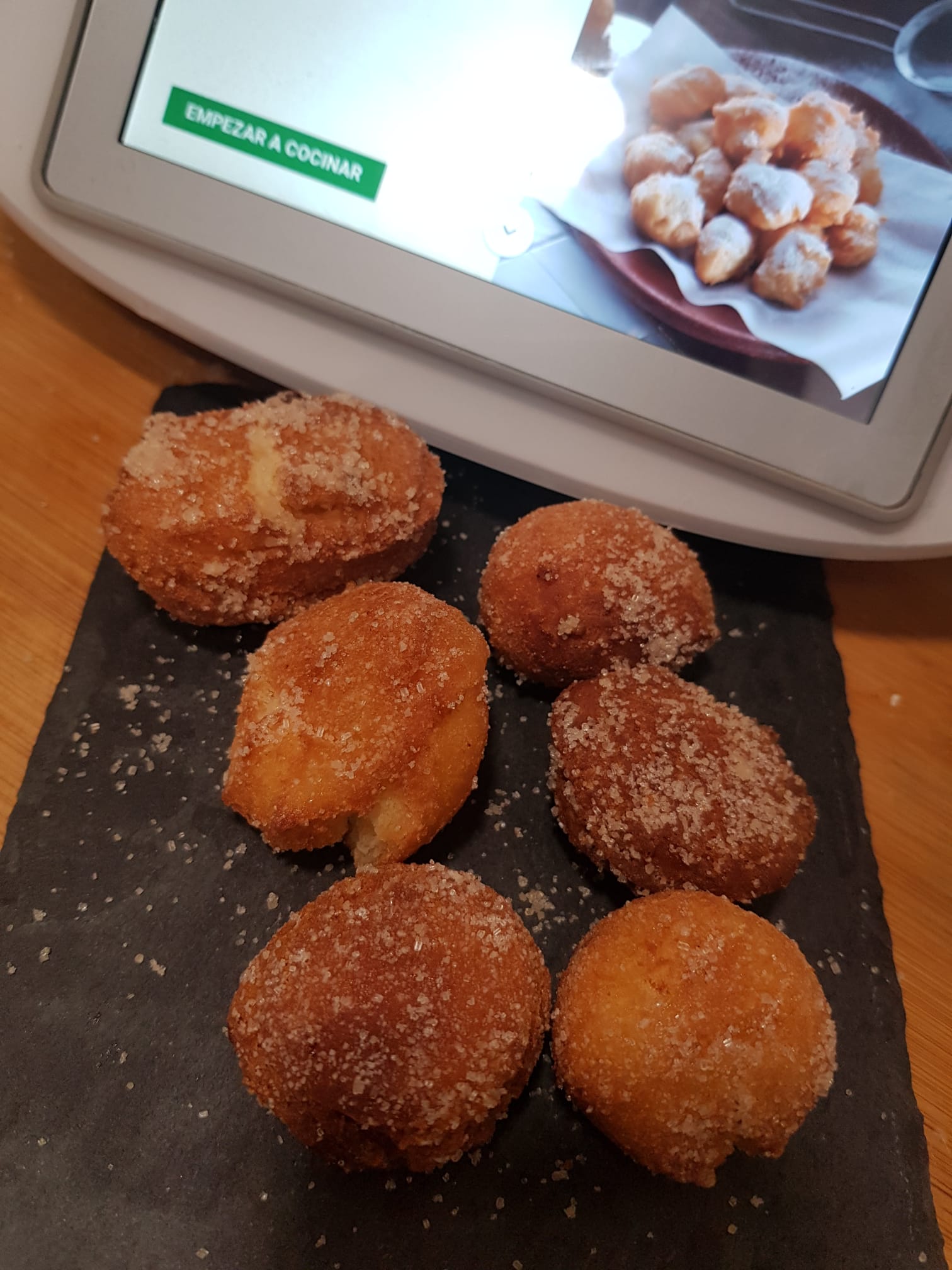 Llega la temporada de probar este postre tan típico de la Quaresma, en este caso con harina sin gluten y también he añadido harina de arroz, al ver que me quedaba algo líquida dejándola reposar mas de 1 hora en la nevera, no había forma de esperarla por eso decidí hacer bolitas pequeñas con cucharita y rebozar en harina de arroz (pulverizando granos de arroz 40 seg. vel 5-10) y después poniéndolas en el aceite bien caliente pero pasándolas por un bol con el almíbar preparado. Una vez con el aceite bien caliente sin que humee, las freímos bien y al acabar las rebozamos en azúcar avainillado.