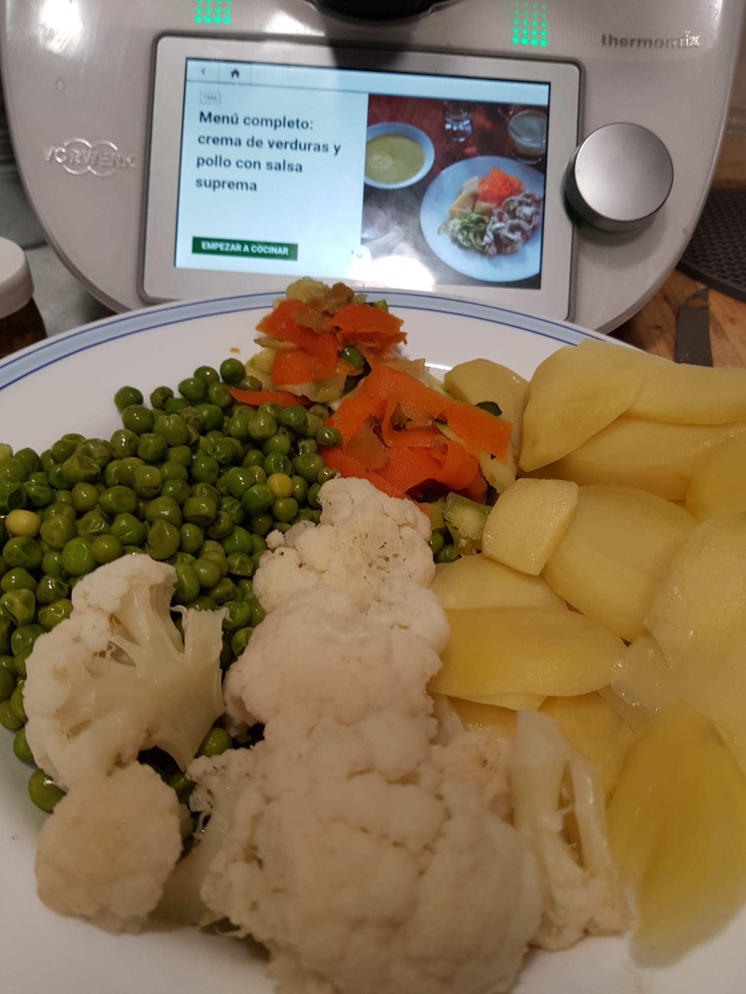 al mismo tiempor que se hace el concentrado ponemos nuestro varoma repleto de verduras, en mi cado, guisantes, calabacín, patatas, zanahoria y huevo.