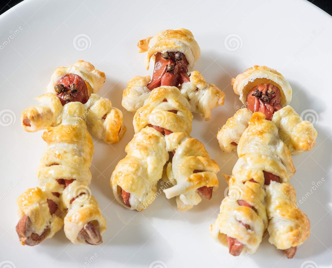 Ponga el agua en el vaso. Sitúe el recipiente Varoma en su posición con las salchichas, tape el Varoma y programe 10 min/Varoma/vel 2. Mientras tanto, mezcle en un bol el huevo con la leche. Extienda con el rodillo (si fuera necesario) las masas de hojaldre hasta que tengan un grosor de 2-3 mm y pincele la superficie con la mezcla de huevo y leche. Después, corte la masa en tiras de aprox. 35 cm de largo y 6 mm de ancho. Retire el Varoma y deje templar las salchichas (aprox. 10 minutos). Precaliente el horno a 200°C. Forre una bandeja de horno con papel de hornear. Seque las salchichas con papel de cocina y envuelva cada una en una tira de masa, solapando las tiras ligeramente (para que se asemejen a un vendaje) y dejando libre un espacio donde colocar los ojos. Colóquelas en la bandeja preparada. Hornee durante 15-20 minutos (200°C) o hasta que la masa se haya dorado e inflado. Deje templar aprox. 5 minutos antes de decorar con gotas de mostaza que simulen los ojos. Sirva calientes acompañadas de ketchup.