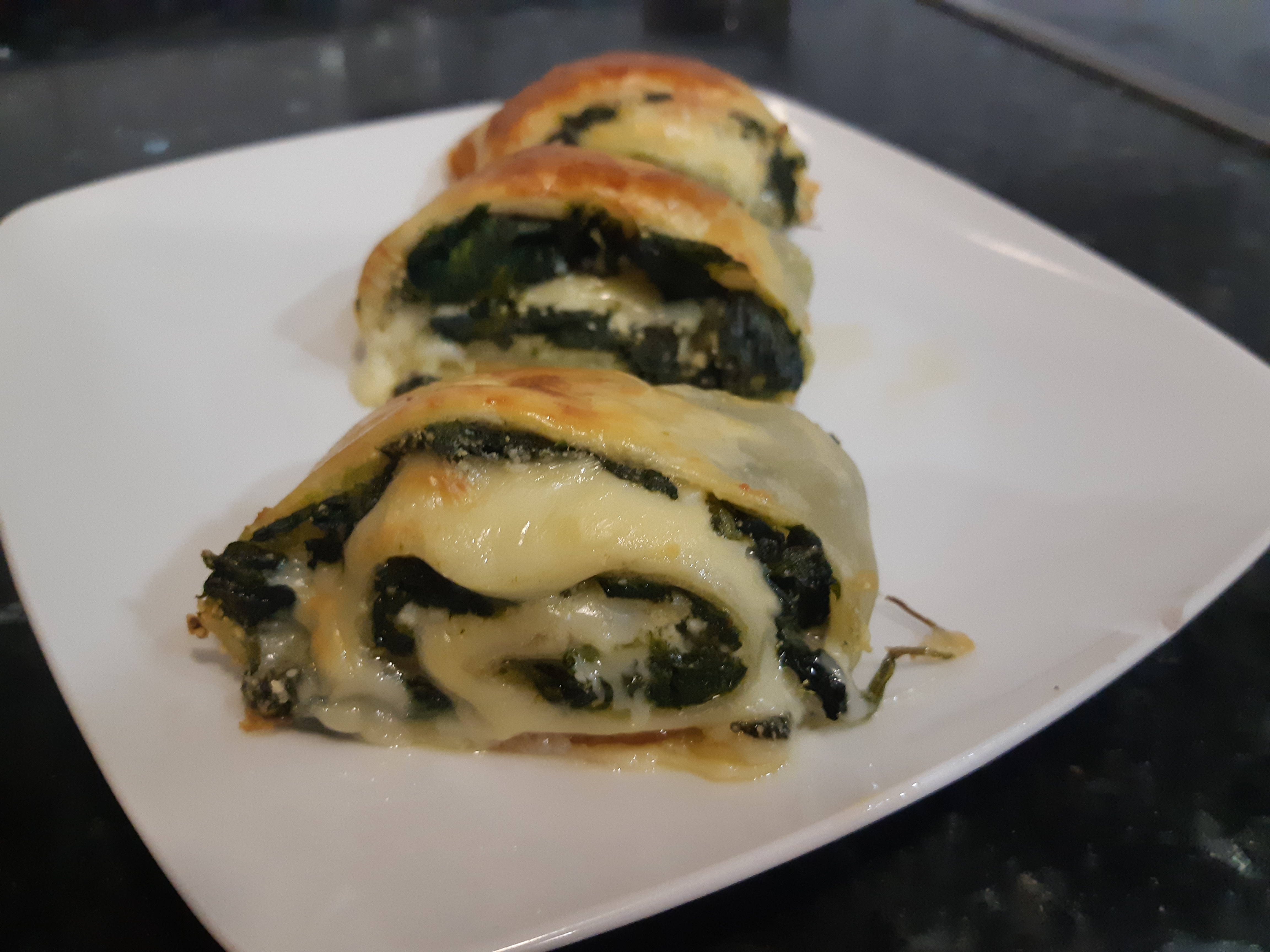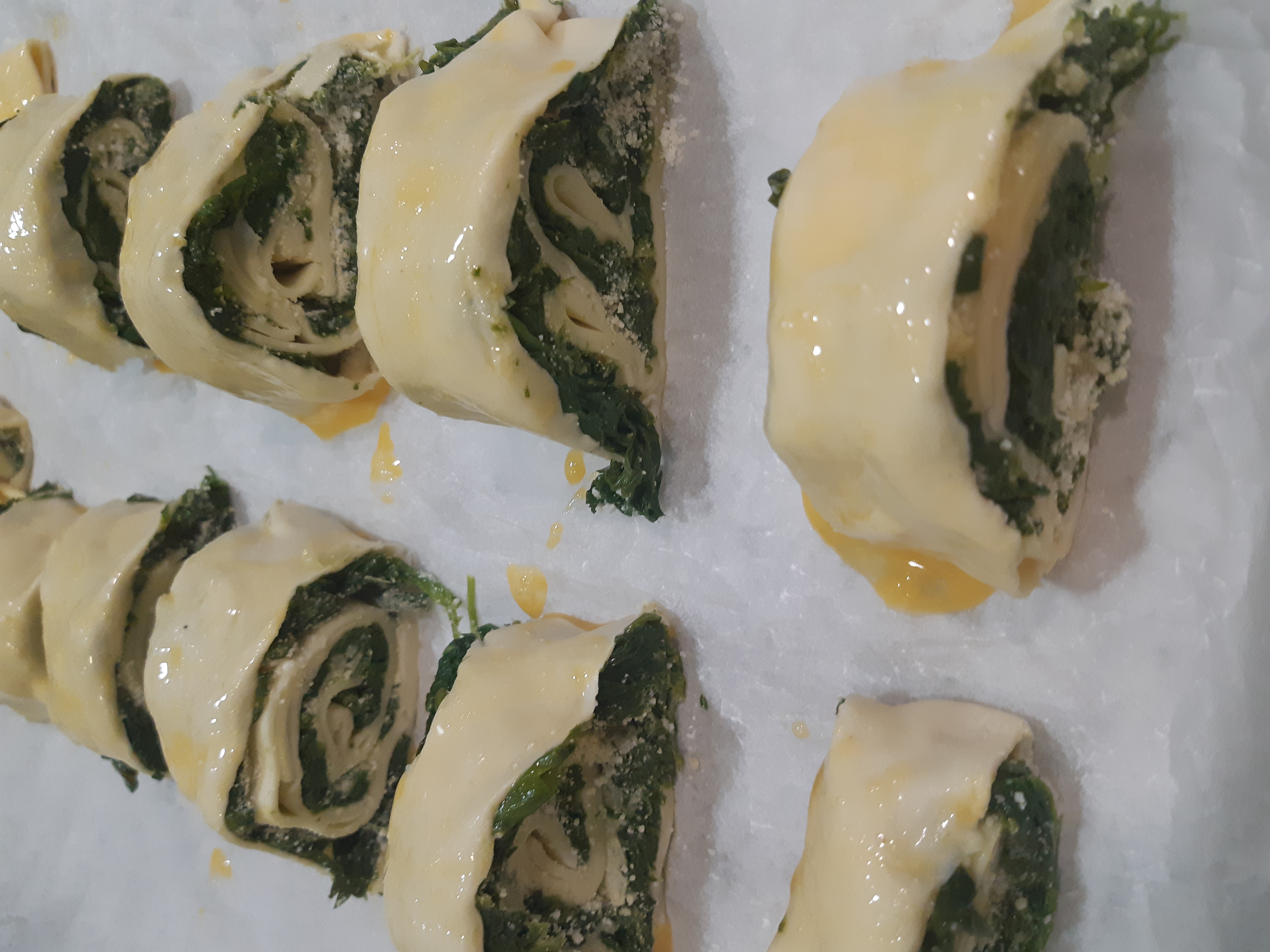 Precaliente el horno a 200°C. Forre una bandeja con papel de hornear y reserve.Extienda la lámina de hojaldre en una mesa de trabajo y pincélela con el huevo batido. Distribuya las espinacas sobre el hojaldre, dejando un borde de 2 cm libre en uno de los extremos más largos. Espolvoree el queso parmesano reservado y reparta el queso feta. Enrolle el hojaldre como si fuera un brazo de gitano, córtelo en rodajas de 1,5 cm de grosor y colóquelas en la bandeja de horno. Con ayuda de la espátula, presione ligeramente cada rodaja y pincele con el huevo batido.