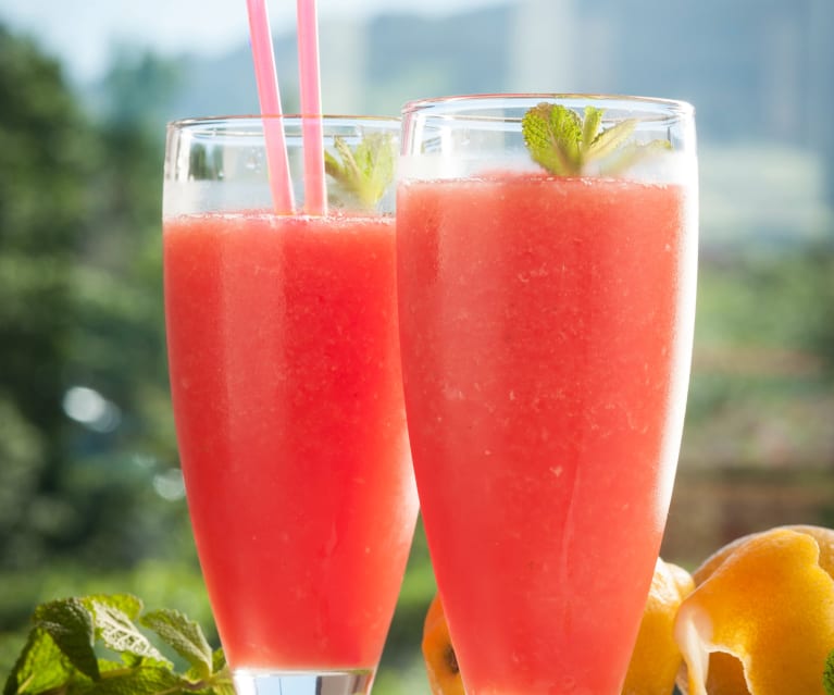Añada los cubitos de hielo y triture 30 seg/vel 5. Vierta en copas, decore con hojas de menta y sirva inmediatamente.