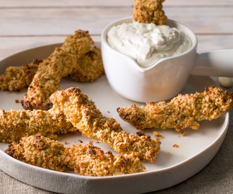 Reboce las tiras de pollo espolvoreadas con sal pasándolas por la maicena, los huevos batidos y la mezcla de almendra, avena y especias. Colóquelas en la bandeja de horno y riegue con un chorrito de aceite. Hornee durante 10-15 minutos o hasta que estén doradas y crujientes. Sirva calientes acompañados con la salsa ranchera o otra salsa a tu gusto.