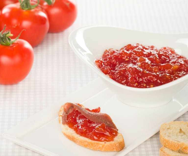 Ahora que es epoca de tomates, vamos a preprarar esta mermelada para servirla en tostas con anchoas, jamón, quesos, etc. o como acompañamiento de patatas asadas o fritas. ¡¡Teneis que probarla!!
