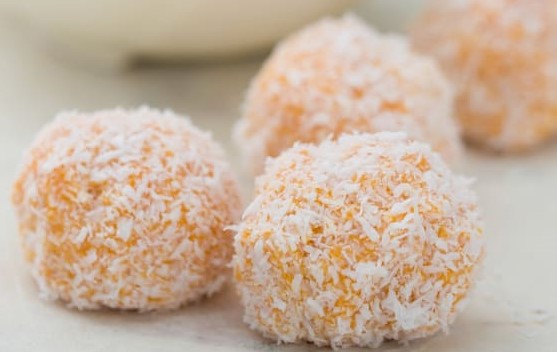 Lave las batatas, pínchelas con un palillo 8-10 veces, envuélvalas en film transparente y cocínelas en el microondas durante 8-10 minutos a máxima potencia o hasta que esté bien cocida. Deje templar durante 10 minutos y pélelas. Ponga en el vaso los orejones y trocee 5 seg/vel 6. Con la espátula, baje el ingrediente hacia el fondo del vaso. Incorpore el zumo de naranja. Triture 10 seg/vel 10 y caliente 3 min/100°C/vel 2 Añada la batata cocida, la almendra molida, 40 g de coco rallado, la mezcla de 5 especias, la piel de naranja rallada y la sal y mezcle 15 seg/vel 6. Con dos cucharitas forme bolas del tamaño de una nuez y rebócelas con coco rallado. Reserve en el frigorífico hasta el momento de servir.