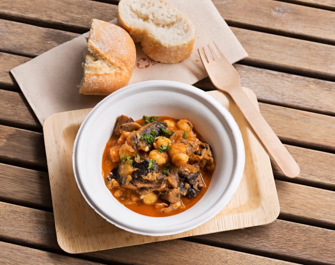 Ponga los garbanzos en el recipiente Varoma, aclárelos con agua, tape y reserve. Ponga en el vaso la cebolla, el ajo y el aceite. Trocee 3 seg/vel 5 y sofría 10 min/120°C/vel 1. Coloque la mariposa en las cuchillas. Añada las setas y el pimentón y rehogue 2 min/120°C/giro a la izquierda/vel1. Incorpore el tomate frito, 2 cucharadas de garbanzos, el caldo, la cayena, el comino, la sal y la pimienta. Sitúe el Varoma en su posición y programe 10 min/Varoma/giro a la izquierda/vel 1. Retire el Varoma. Añada al vaso los garbanzos del Varoma y programe 2min/100°C/giro a la izquierda/vel 1. Retire la mariposa y vierta los garbanzos en una fuente. Espolvoree con la hierbabuena y sirva.