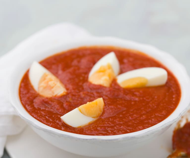 Precaliente el horno a 200°C. Coloque los pimientos en una bandeja de hornear y reserve. Ponga una jarra sobre la tapa del vaso, pese en ella 80 g de aceite de oliva y reserve. Ponga en el vaso el tomate triturado, coloque el cestillo en lugar del cubilete y programe 15 min/Varoma/vel 1. mientras tanto, envuelva los huevos, por separado, en film transparente y reserve en el recipiente Varoma. Sitúe el recipiente Varoma en su posición, tape el Varoma y programe 15 min/Varoma/vel 1. Retire el recipiente Varoma, refresque los huevos en agua fría. Vierta el tomate en un recipiente hermético y reserve. Lave y seque el vaso. Hornee los pimientos durante 30 minutos (200°C). Mientras tanto, pele los huevos y reserve. Retire los pimientos del horno, deje enfriar aprox. 1 hora. Pele los pimientos, retire las semillas (reserve el jugo) y corte en tiras. Reserve en el recipiente hermético con el tomate. Ponga en el vaso 30 g del jugo de los pimientos, los ajos, el comino y la sal y triture 1 min/vel 7. Con la espátula, baje los ingredientes hacia el fondo del vaso y mezcle 1 min/vel 4 y, con la máquina en marcha, vierta el aceite lentamente sobre la tapa, dejando que caiga en un hilo muy fino alrededor del cubilete para lograr una emulsión. Vierta la emulsión en el recipiente hermético y mezcle con la espátula. Reserve en el frigorífico (aprox. 2 horas) y sirva acompañado de los huevos cocidos cortados en cuartos.